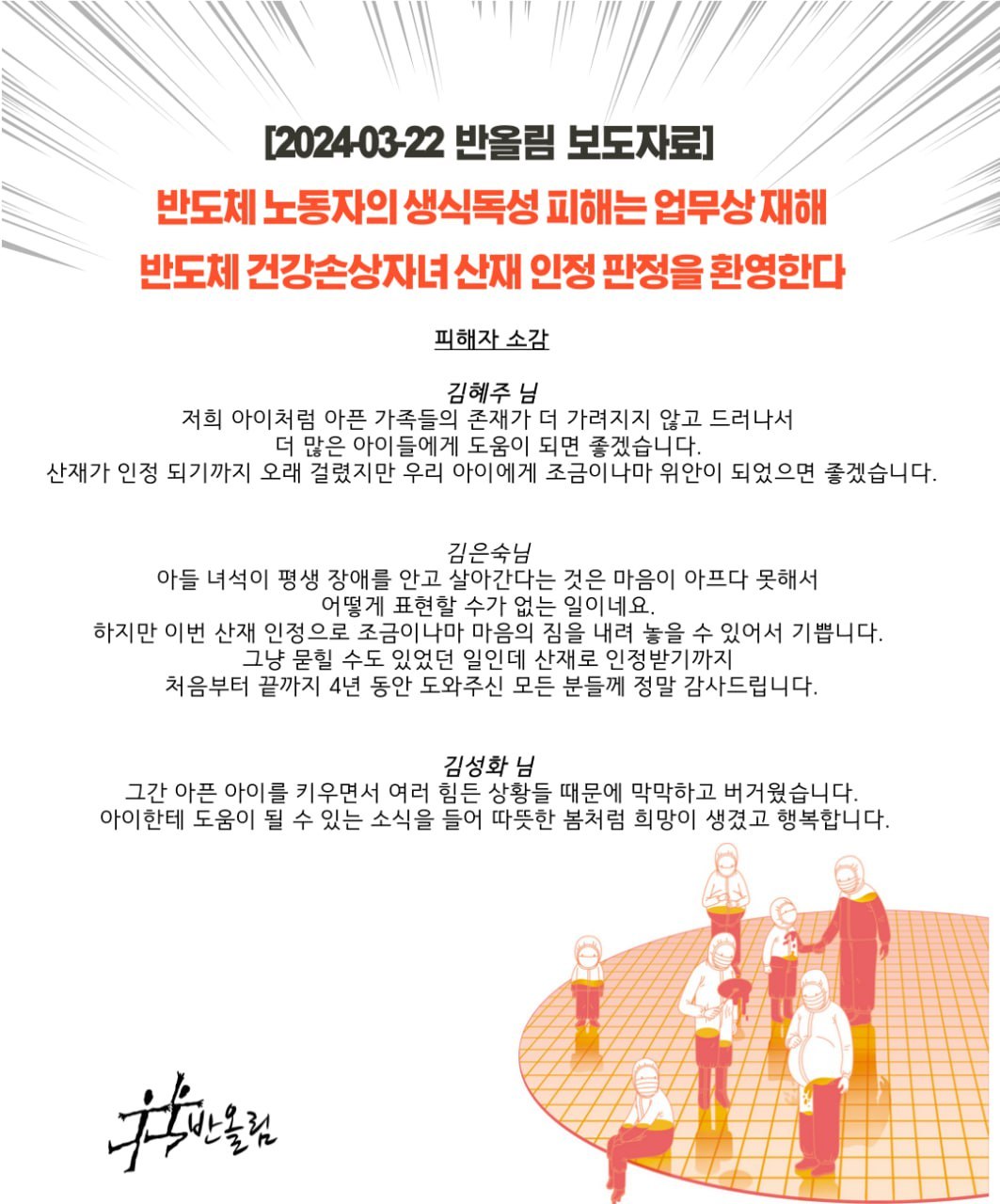 어제 반도체 노동자의 자녀건강손상을 산재로 인정하는 판정이 있었다. KBS, SBS 등 언론에서 다루었다. 피해자들은 자신의 고통의 이유를 알게 되었고, 그간 노력해 준 반올림에 감사했고, 또 다른 아픔들에 이름이 붙고, 위로가 되길 바랐다.