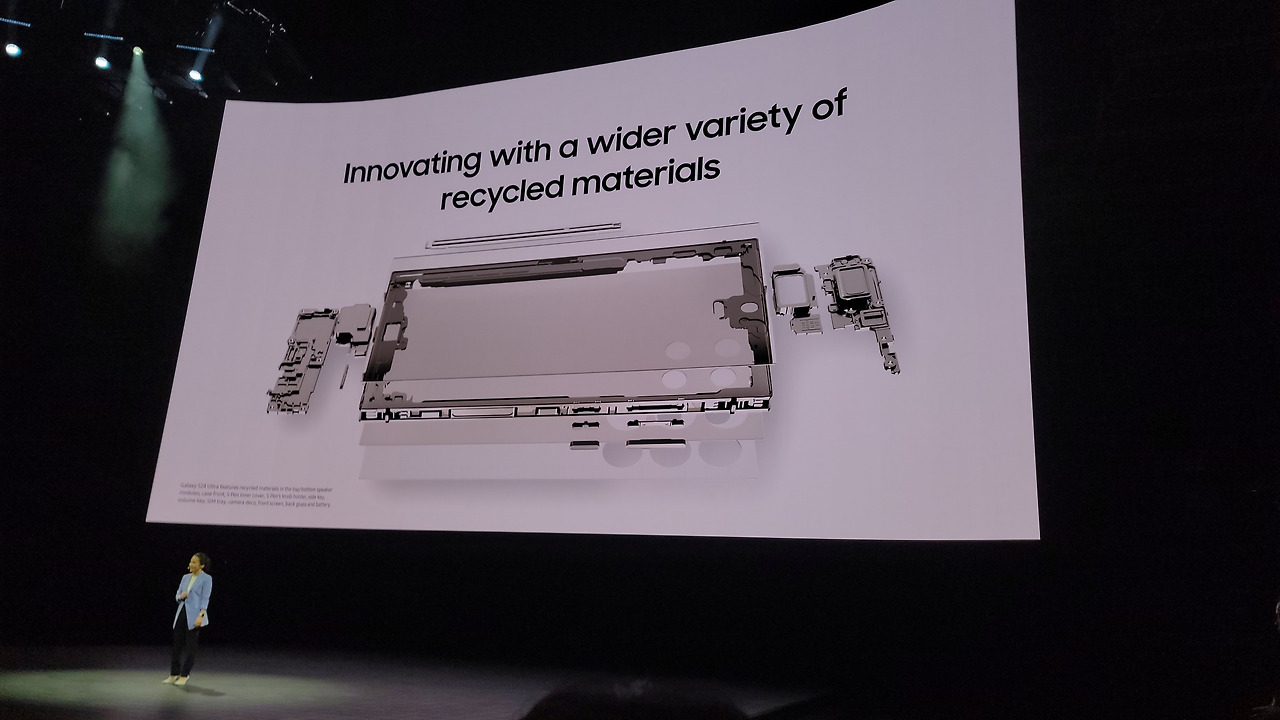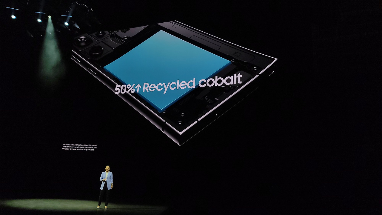 환경과 관련된 얘기로 넘어갔다. S24 시리즈는 재활용된 철강 및 산업 폐기물에서 얻은 고무와 유사한 플라스틱인 TPU, 그리고 재활용된 코발트와 희토류가 최초로 적용되었다.