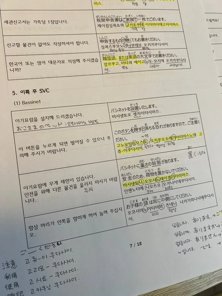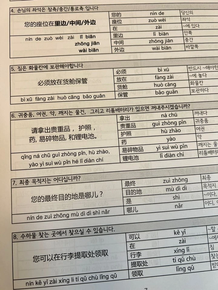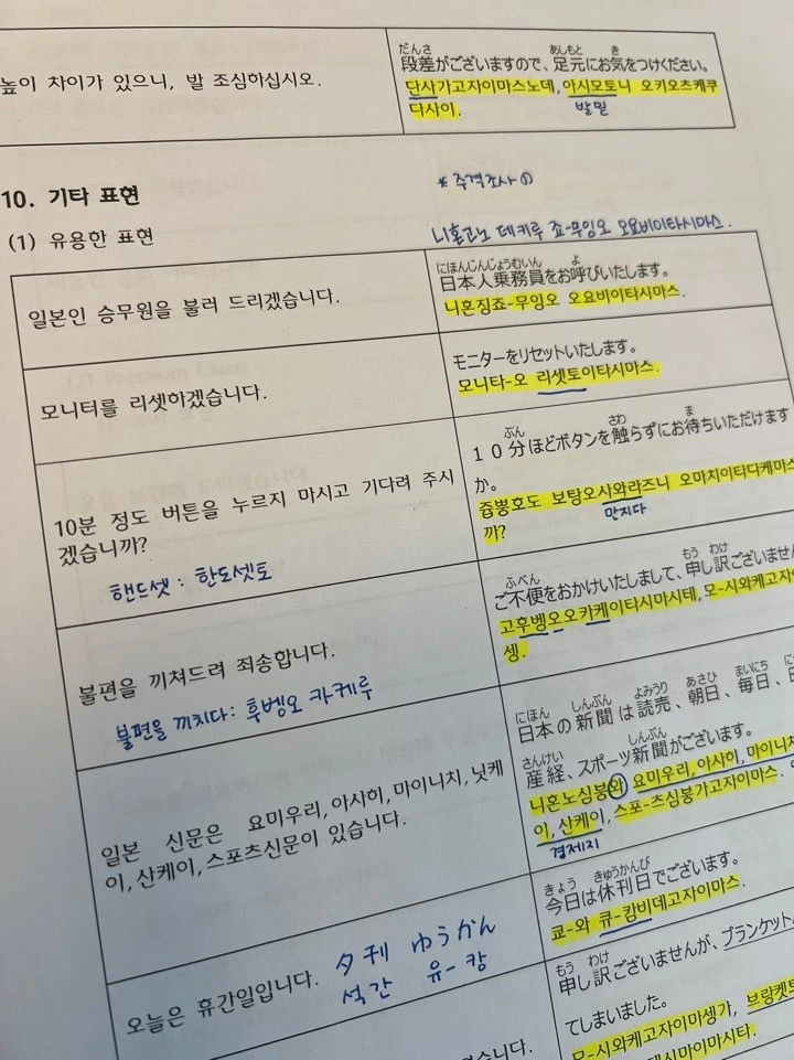 신입 교육 때 기내 일본어, 기내 중국어라고 기내에서 많이 쓰는 제2외국어를 배우는 수업이 있다. 한국과 가까운 나라다 보니 일본어와 중국어를 기본으로 하게끔 가르치는 것 같다. 중국인과 일본인은 비행기에서 많이 만나는 만큼 기내에서 서비스하는 내용은 어느 정도 말할 수 있어야 하니까. 수업은 안전에 관해서, 입출국서류와 관련해서, 그리고 식사와 음료, 면세품 구입, 결제에 관해서 등 비행전반에 필요한 상황의 문장만 모아서 암기하도록 가르친다.