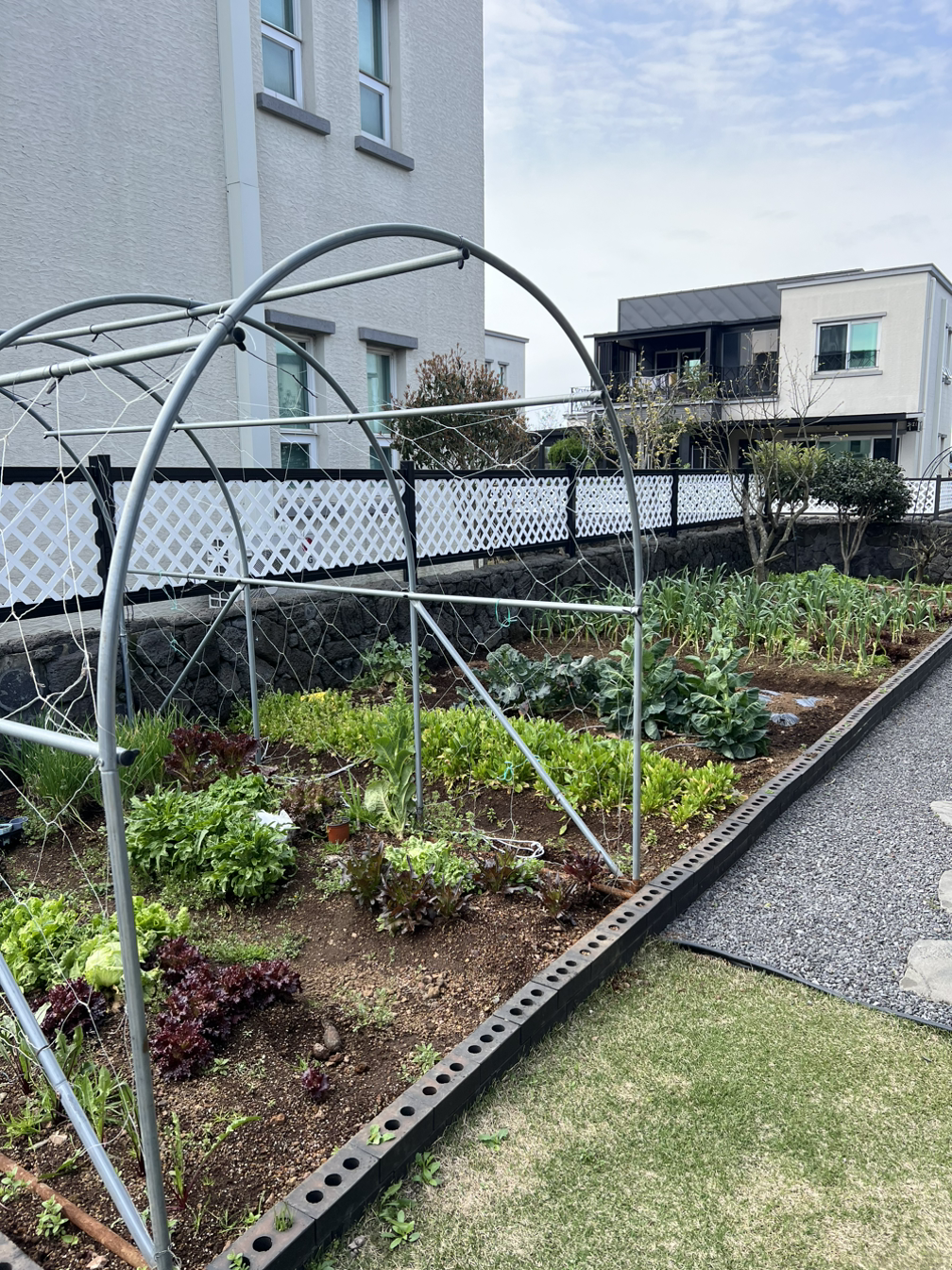 내가 꿈꾸던 이상적인 제주살이를 하고 있는 그 언니가 너무 매력적으로 보였고, 겨우 한 달에 한번 정원관리사가 와서 잔디를 깎고 정원을 꾸며주고, 뒤에 집 주인이 만들어 둔 텃밭 틀이 있음에도 불구하고 아무것도 키우고 있지 않은 휑한 나의 집 마당이 생각나서 부끄러웠다. 그래도 어쩌겠냐, 이런 전원생활은 그저 평생의 로망으로만 남겨두고 싶을 뿐, 나는 그렇게 살 수 있는 사람이 아니다. 워낙에 똥손이라 식물기계 '틔움'의 도움으로 비타민과 루꼴라를 겨우겨우 키워냈는 걸.. 그마저도 수확해줘야 할 때 수확하지 않아 너무 억세 져서 제대로 먹지도 못했다. 몇 달간 물을 주지 않아도 아직 잘 자라고 있는, 둘째 어린이집에서 만들어온 테이크아웃 컵에 담긴 개운죽에 감사하다.
