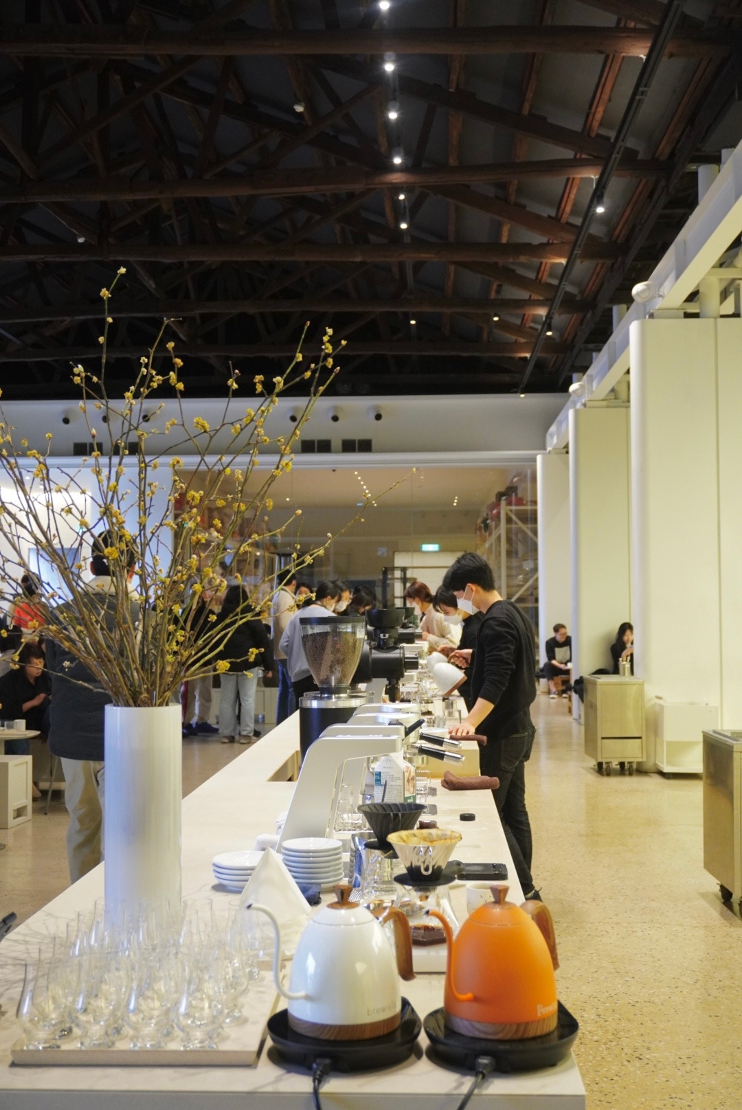 영도지점은 이름조차 '모모스 로스터리&커피바'이듯 통유리 너머로 원두 로스팅, 보관실, 연구실 등이 다 보여요. 바리스타들이 커피를 내리는 것 또한 오픈바에서 볼 수 있어요. 즉 내 커피를 만드는 모든 과정을 볼 수가 있는 거죠. 커피가 내려지는 동안 바리스타들에게 이것저것 물어보는 것도 환영이라고 해요