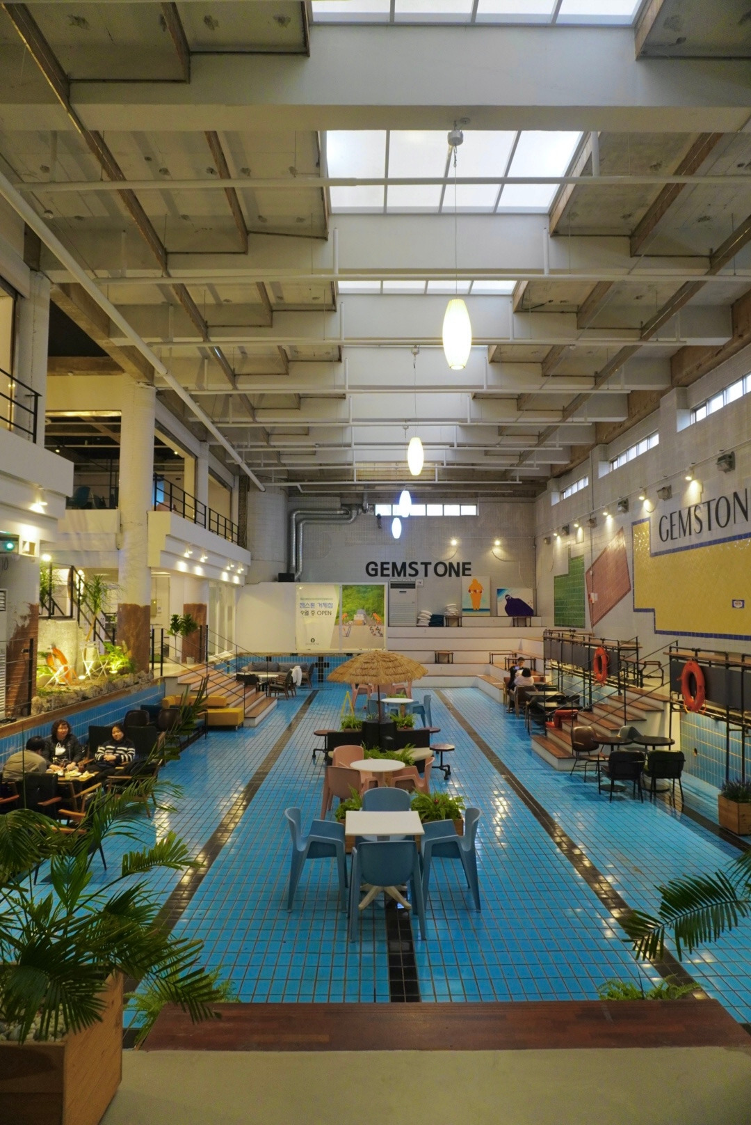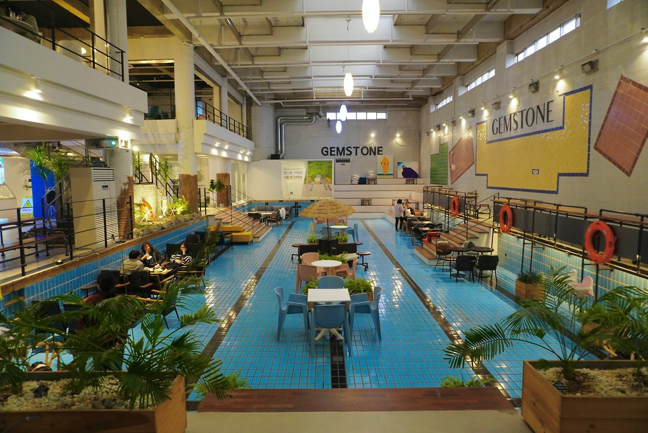 젬스톤의 뜻은 '원석'입니다. 원석을 보석으로 만들겠다는 의미를 담았다고 해요. 영도점은 원래 14년간 방치된 스포츠센터가 있던 자리였어요. 수영장을 포함한 넓은 스포츠센터를 카페로 개조한 것이죠. 카페의 컨셉이 점점 더 다양해지고 있긴 하지만 새로운 공간들은 항상 신선하더라구요.