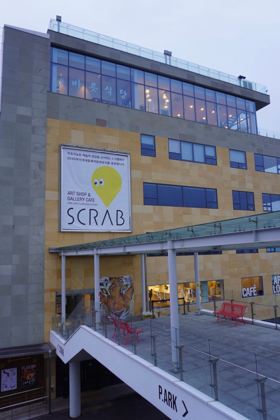 대신에 피아크와 연결된 건물의 스크랩이란 보석 같은 공간을 발견했어요 . 아마 이 공간이 피아크 공간소개에 나온 예술, 전시의 공간이 아닐까 싶습니다. 스크랩은 부산을 기반으로 활동하며 카페, 아트샵, 갤러리로 공간을 구성해서 아트라운지의 역할을 하는 브랜드이자 공간이라고 해요.