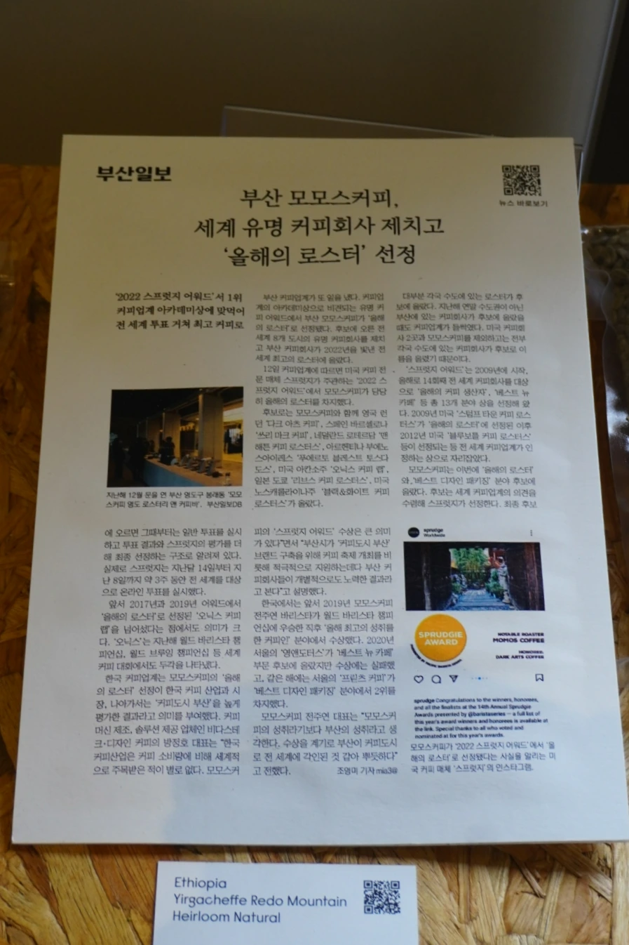 그 밖에 부산과 연관성을 가진 독특하고 다양한 MD상품들도 볼 수 있고, 심지어 공간 한편에는 부산커피의 역사가 담긴 사료도 전시되어 있었어요. 이 모든 것은 QR코드를 통해 오디오설명을 들을 수 있어요. 오디오 큐레이션을 카페에서 듣게 되다니! 게다가 평일 오전에는 도슨트도..?!