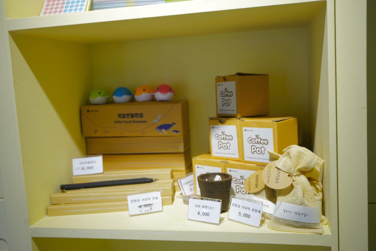 입장하고 보이는 광경은 여느 카페와 같았어요. 주문 후 찬찬히 구경을 하니 벽면 한편엔 공주 관련 각종 단행본, 공주산성 행사 리플렛, 커피굿즈 등을 볼 수 있었어요. 이때 본 자료 중에 산성상권 근처의 수상할 정도로 많은 맨홀에 대한 글이 있었는데 별건 아니었지만 아직도 기억이 나요. 지금은 제민천이 작은 내천에 불과하지만 옛날엔 비가 많이 오면 금강과 제민천에서 역류한 물로 그 일대가 수몰되기도 했다고 해요. 지금은 건물들로 차있지만, 예전엔 수몰지역들이 거의 다 논이었고, 그 많은 맨홀들은 옛날 논들의 흔적이라고 합니다. 이런 알쓸신잡스런 정보들은 여행을 더 흥미롭게 만들어주는 것 같아 전 대환영합니다!