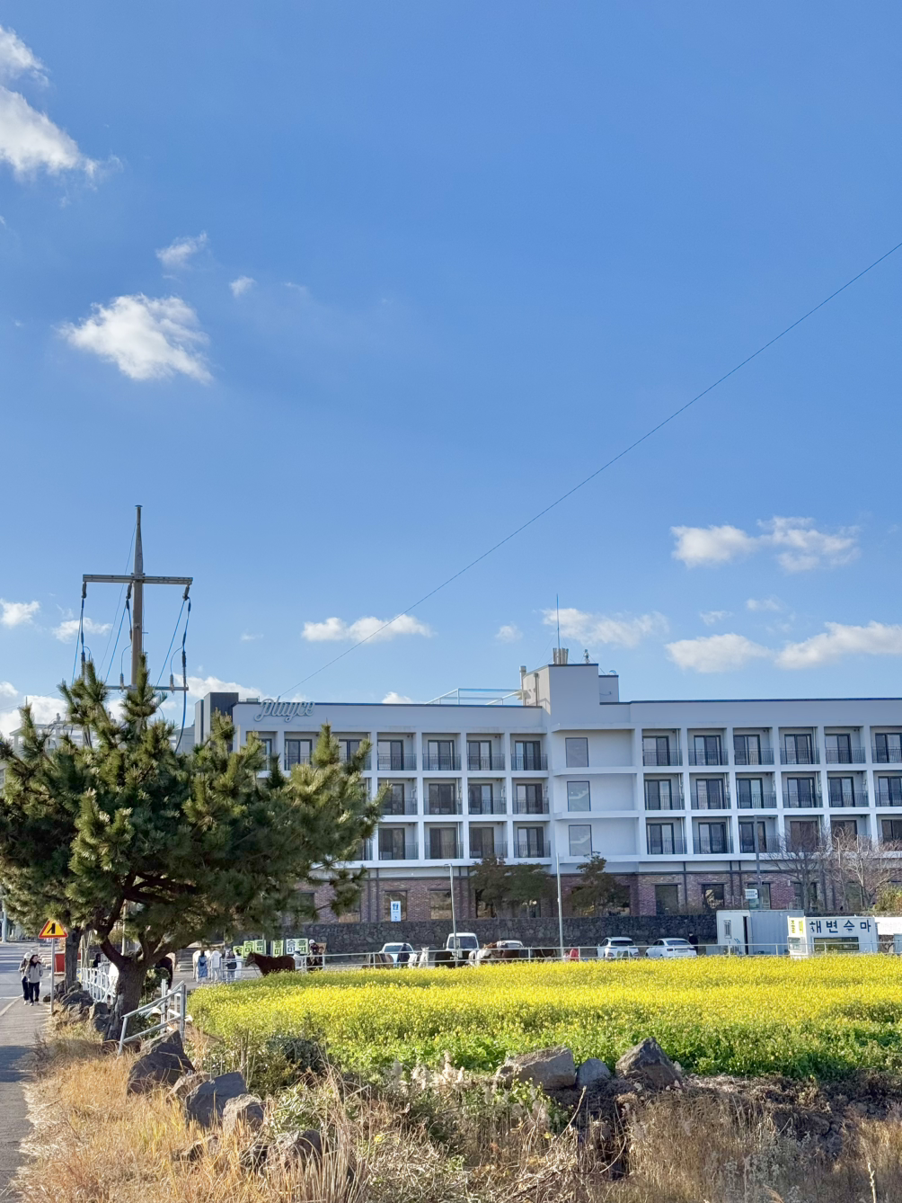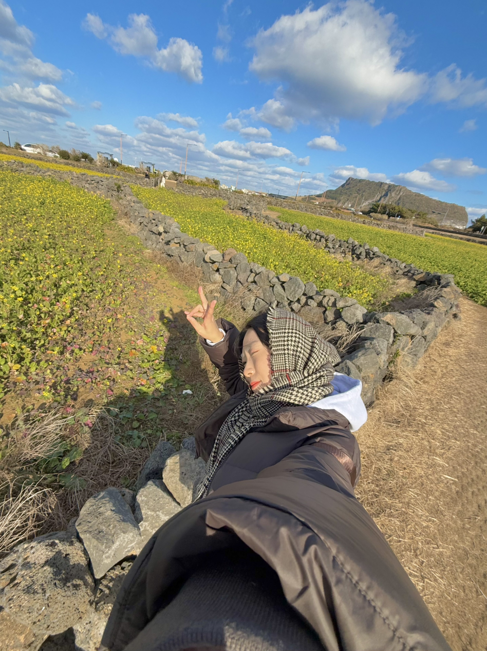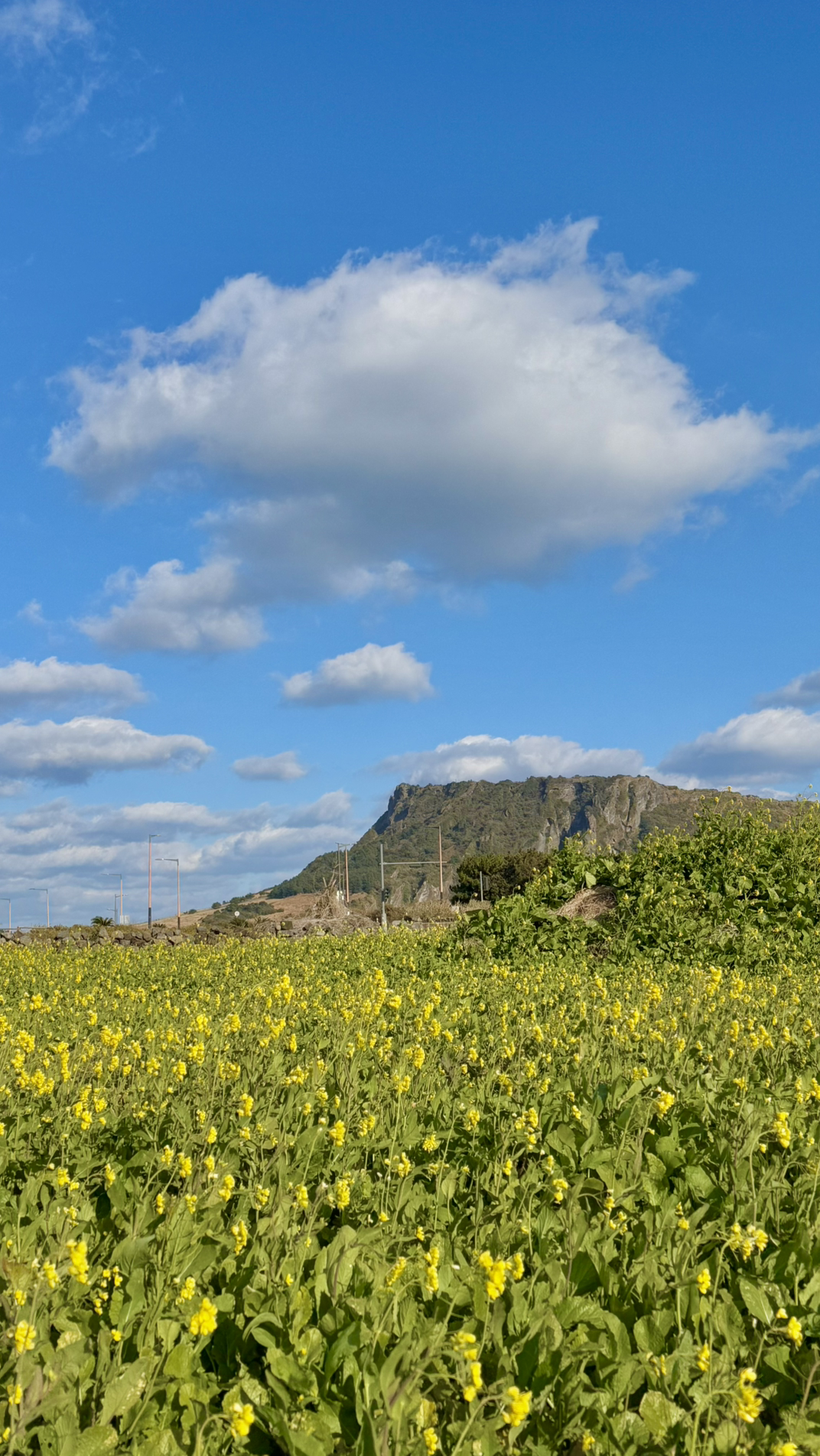 숙소가 있던 고성리와 성산일출봉이 있는 성산리를 연결하는 길에 정말 드넓게 유채꽃밭이 펼쳐져 있었어요. 사설업체가 운영하는 곳이 아니라, '유채꽃재배단지'라고 해서 공공에서 관리하는 듯해 보였습니다! 덕분에 입장료 없이 무료로 사진 찍을 수 있었어요! 정말정말 넓고, 사람이 없어서(물론 아직 유채꽃이 덜 피긴 했지만) 숨은 유채꽃 명소랄까요?!