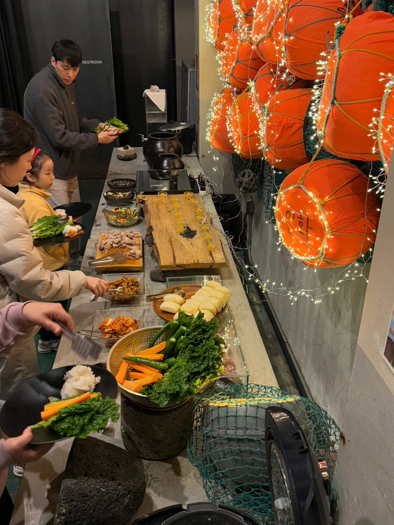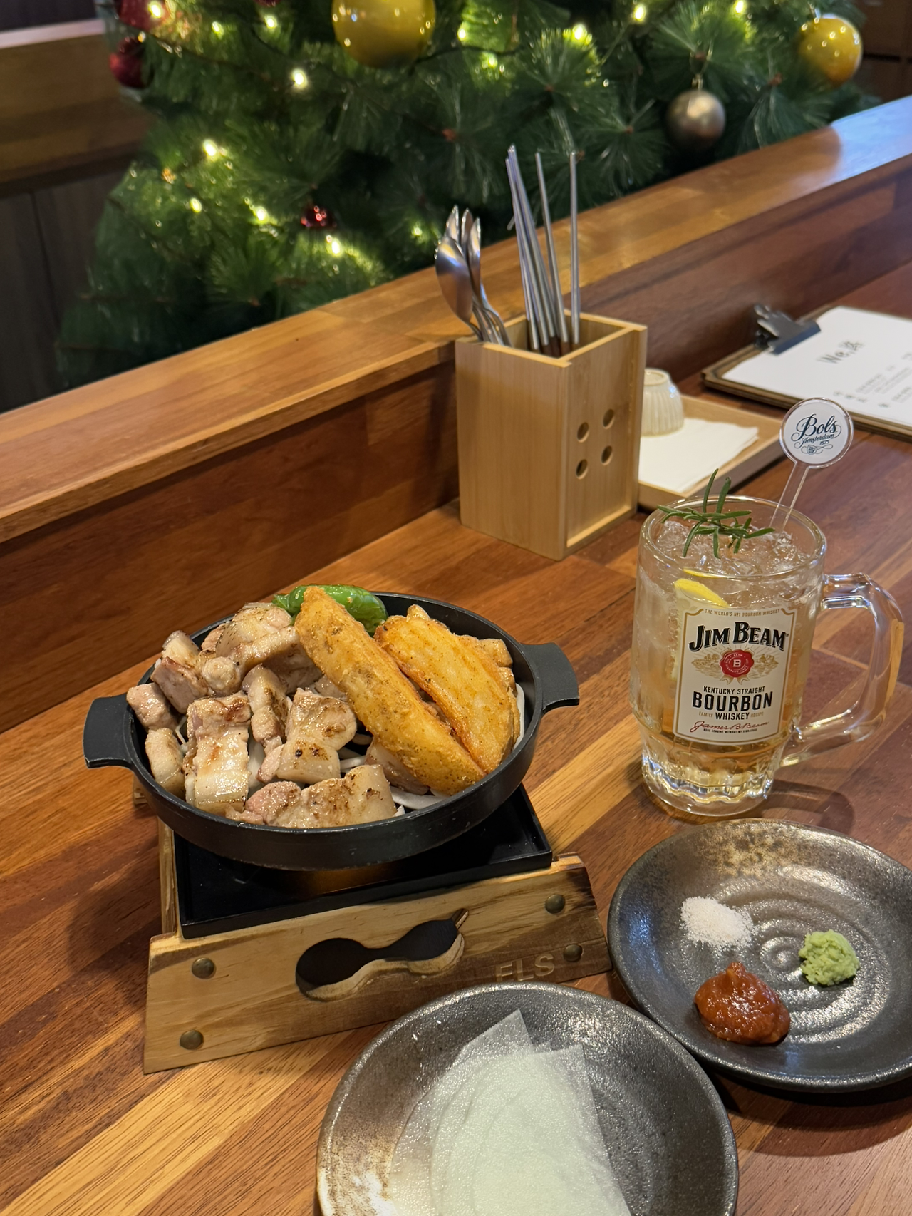 소식좌의 혼여행엔 몇 가지 슬픔이 있습니다. '2인 이상'이란 텍스트의 장벽이죠. 제주흑돼지를 너무나 먹고 싶었지만 2인분은 무리여서(남기는 게 참 죄송함) 흑돼지를 못 먹고 돌아왔다? 이건 제 제주여행에서 말이 안 되는 말입니다. 오히려 혼밥러가 더 많았던 흑돼지집을 찾았지요! 플레이스캠프 숙소 안에 있는 곳이었어요. 1인 화로에 구워 먹었고요 하이볼이랑 조합이 참 좋았답니다.