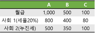 세금 제도가 다른 두 사회에 A, B, C라는 세 사람이 존재한다.