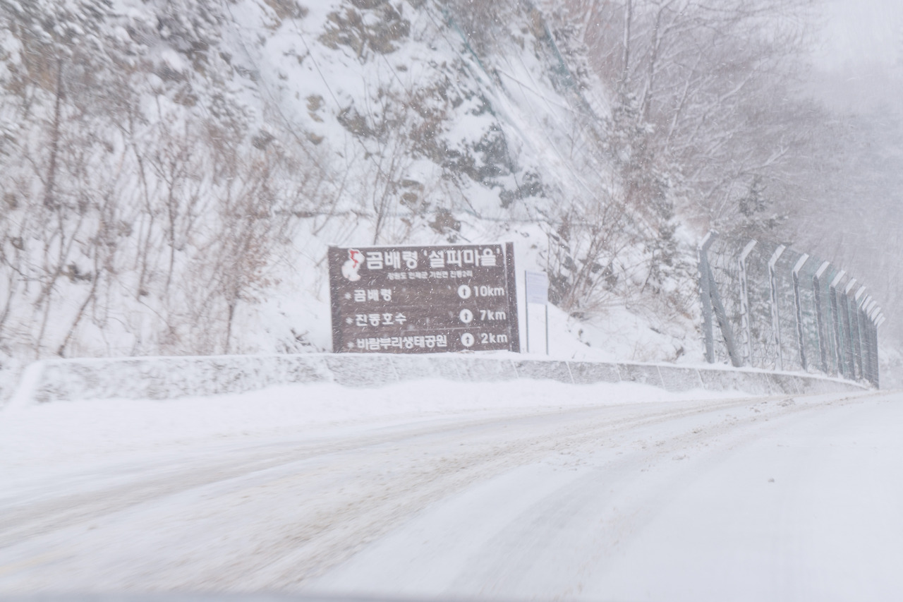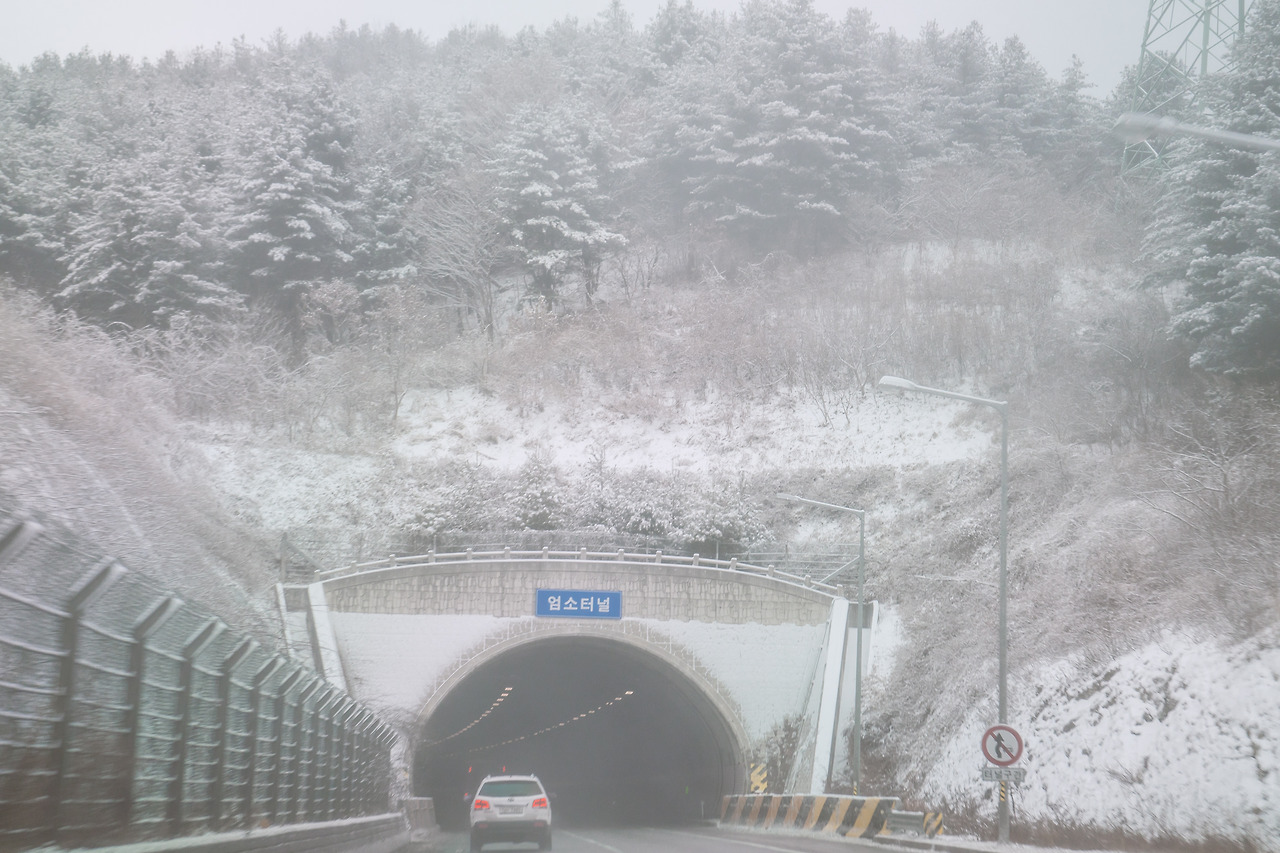 이미 강원도에 진입한지는 한참 되었고 눈길을 달리는 일도 이제 조금씩 익숙해져갔다. 곰배령 가는길 표지판을 지나쳐 왔기에 지금 넘는 고개가 곰배령인가 싶었는데 불현듯 '조침령 터널'이 나타났다. 그랬구나. 우리는 조침령에 있는 것이구나.