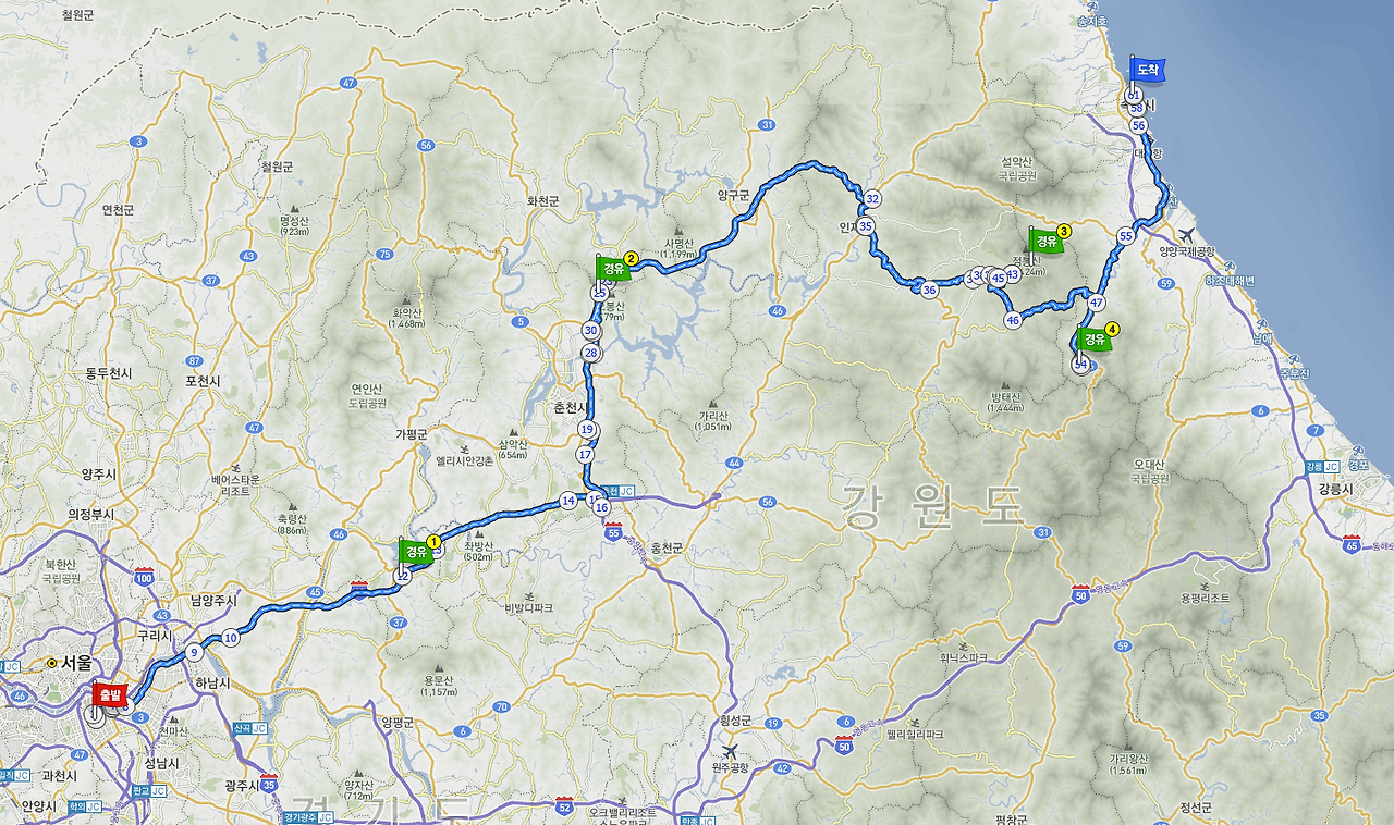 정확하지는 않지만 기억 나는 지점들을 기준으로 복기해보니 대략 위와 같다. 목적지를 정해둔 건 아니고 가다 보니 동해까지 다녀왔다. 기왕 이만큼 넘어왔으니 바다를 보자는 쪽으로 결정을 하게 된 것.