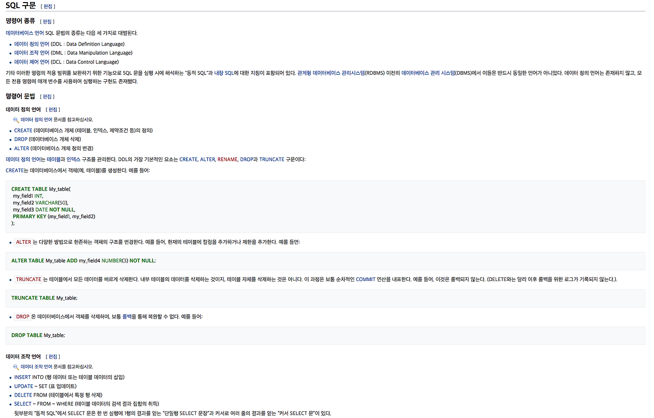 일례로, 위키백과의 'SQL' 항목을 보겠습니다(자세히 보실 필요는 없습니다).