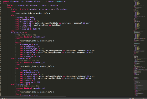 조직에서 기존에 사용하던 쿼리문은 간단할 수도 있고, 아니면 아래 스크린샷처럼 복잡할 수도 있습니다. 기본 문법을 어느 정도 익힌 상황이라면, 어렵더라도 길고 복잡해 보이는 쿼리에 도전해 보시길 바랍니다.