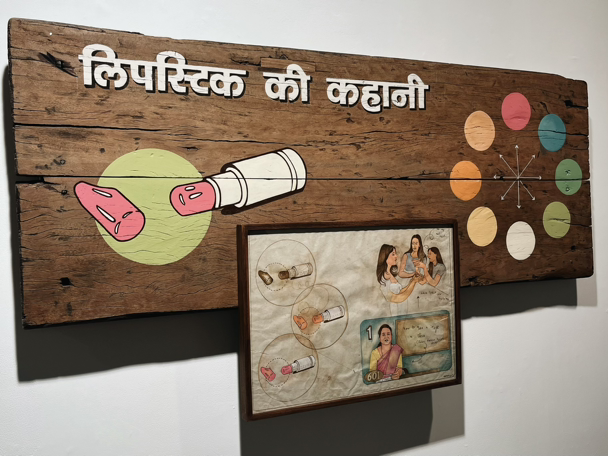 한 작품을 예시로 들자면 모던한 옷차림의 젊은 여성들은 자신에게 어떤 립스틱 컬러가 어울릴지 최근에 받은 네일 페인팅은 어떤지 대화를 나누고 있는 반면 티비 뉴스 화면 같아 보이는 프레임 안에는 인도 전통복인 사리를 차려입은 중년의 여성이 최고의 스타일리스트라며 오피스에서 어떻게 이미지를 만드는가에 대한 코칭을 진지하게 하고 있는 것을 볼 수 있다. 이 작품을 통해 현실을 반영하지 못하는 기성세대와 전통에 대한 비판을 볼 수 있었는데 표현 방식이 참 흥미로웠다.
