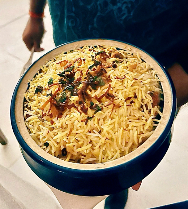 간단하게 설명하면 후추, 정향, 카다멈, 큐민씨, 샤프란, 팔각 등의 향신료를 바스마티 라이스에 스며들게 해서 밥을 지은 다음, 마살라로 양념해 재워둔 닭고기나 양고기 생선을 따로 조리해 시루떡처럼 이 밥과 양념된 재료를 켜를 쌓아 한 번 더 조리한다. 여기에 추가로 숯 향을 입히는 게 이 요리의 마무리이다.