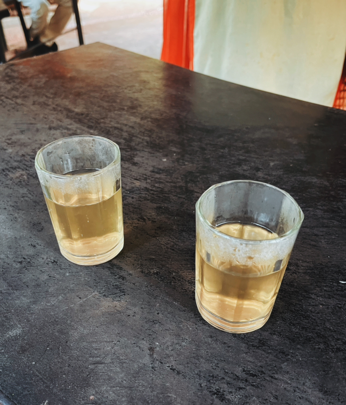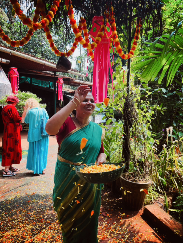 숙소에서 택시를 타고 한 시간 정도 갔을까. 35도 더위에 튼 것도 아니고 안 튼 것도 아닌 미미한 에어컨 바람에 땀을 흘리며 덜컹덜컹 열심히도 달려갔다. 오전에 갔더니 이 시골의 농장 주차장엔 벌써 관광객들의 차들로 빼곡했다. 택시를 타고 왔는데 더 피곤한 것 같은 몸을 이끌고 입구로 들어갔는데 전통복 사리를 입은 직원분이 꽃잎으로 가득 찬 바구니를 들고나와 환한 미소로 꽃가루를 뿌려주며 환영 의식을 해주셨다. 대기하는 공간으로 가니 따뜻한 차를 내어줬다. 무슨 차라고 했는데 잘 못 알아 들어 그냥 맛있게 홀짝홀짝 마셨다. 차를 마시니 멀미가 날 것 같던 기운이 차분하게 가라앉았다.