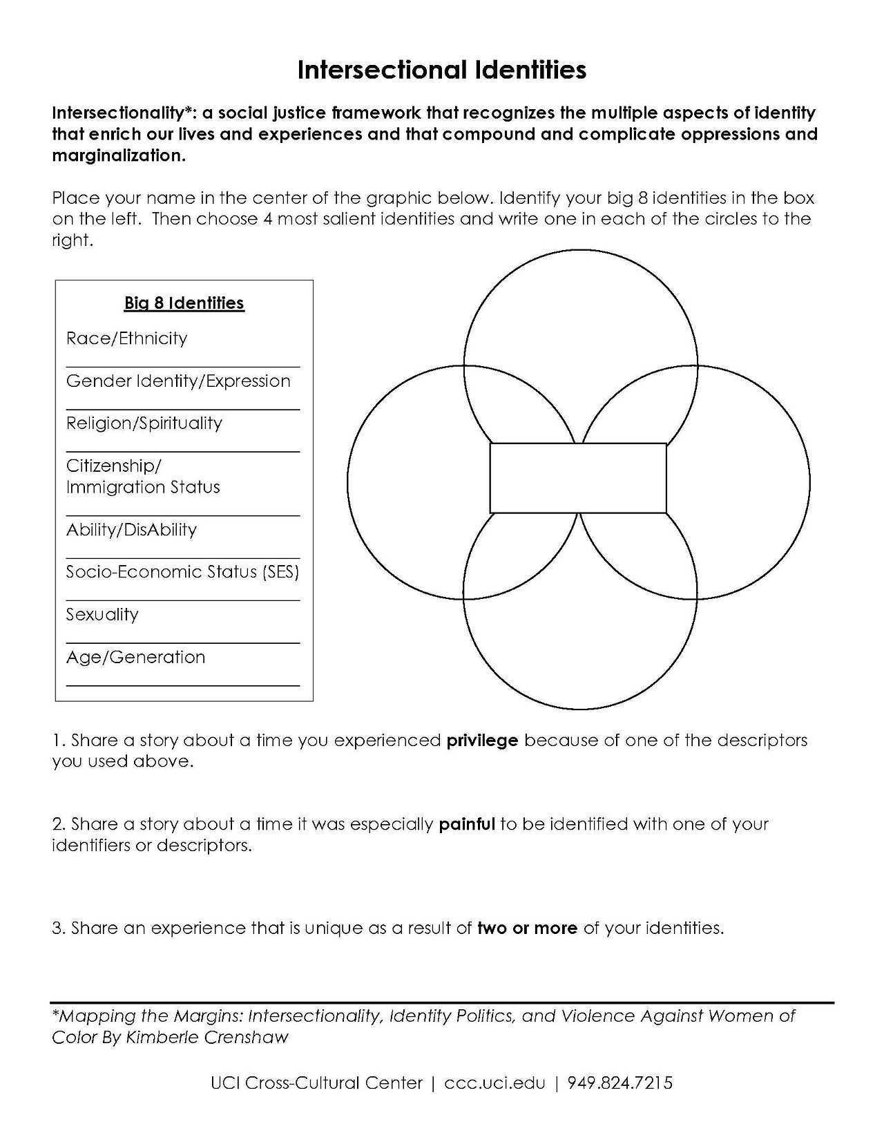 모든 사람에게는 교차성이 존재하는데요. 한 번 나의 교차성은 어떤 모습인지 알아볼까요? UC 어바인에서 제공하는 연습지를 한 번 마음속으로 작성해보세요.