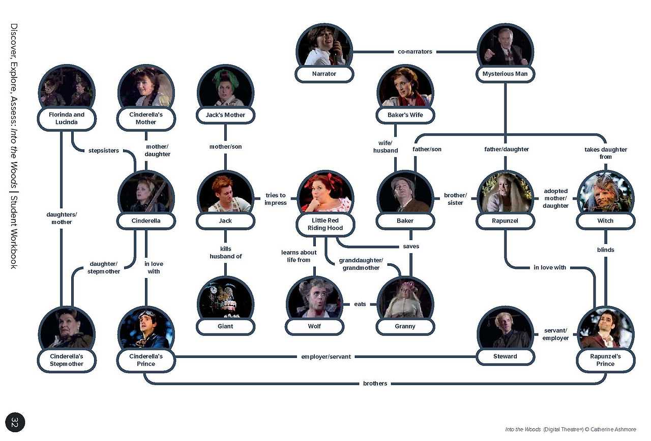 <숲속으로>는 그림 형제의 전래동화 여럿을 하나의 이야기로 모아 재구성하는데요. 빨간 모자, 신데렐라, 라푼젤, 잭과 콩나무 이야기들을 새로운 인물인 빵집 부부를 중심으로 하나로 엮습니다. 놀랍게도 각 이야기들은 하나로 손쉽게 묶이는 공통점을 가지고 있는데요. 원하는 것이 있으며 이를 얻기 위한 모험을 통해 이런저런 고생을 겪고 성장하여 원하는 것을 얻는다는 점입니다. 모든 인물들은 유기적으로 연결되어 하나의 이야기 속에서 복잡한 관계를 이루는데, 여기서 모두 설명하기보다는 그림 한 장으로 이들의 관계를 소개하고 넘어가도록 하겠습니다.