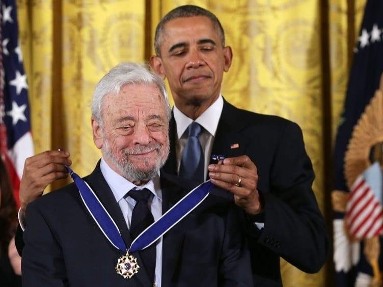 지난해 별세한 손드하임에게 2015년 오바마 전 미국 대통령이 표창장을 수여하고 있습니다.