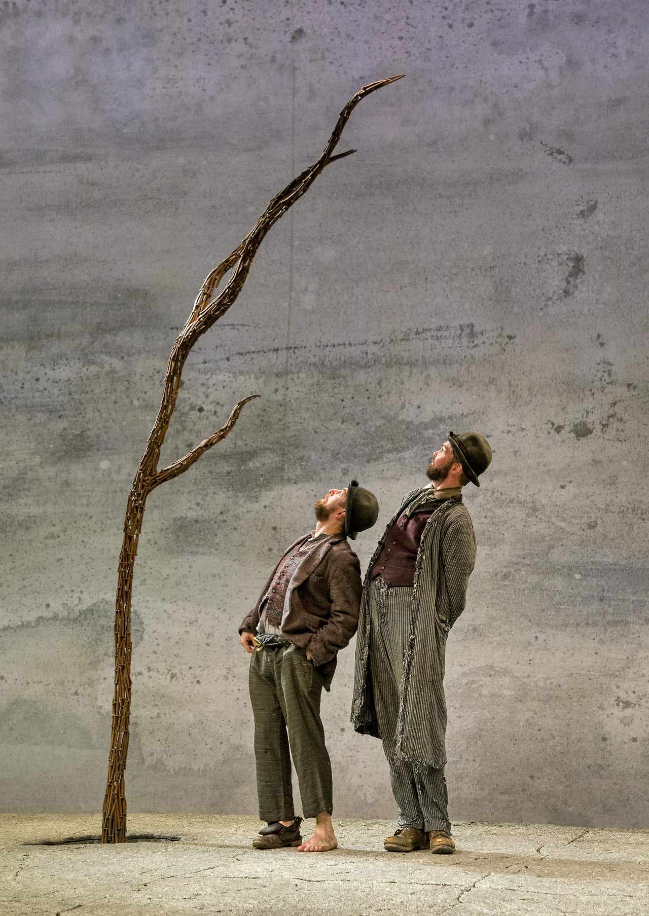 2018년 뉴욕에서 상연된 <고도를 기다리며>의 한 장면입니다. 무채색의 색감과 배경의 황량함을 느껴보세요.