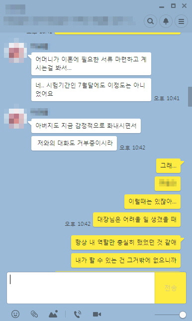 내용은 간단했다. 아버지가 바람피우는 걸 어머니께 들켰던 모양이다. 그래서 낯선 여자의 문자를 해명하라고 했는 데 두 달째 해명을 하지 못했던 모양이다. 물론 그 중간에 학생이 모르는 다툼이 많았을 것으로 생각된다. 그리고 오늘 최악의 국면을 맞았던 것 같았다. 거실에서 어머니의 목소리는 여느 때보다 커져 있었고, '이혼'과 '재산분할'이라는 단어가 어머니 입에서 연신 쏟아져 나오고 있다고 했다.