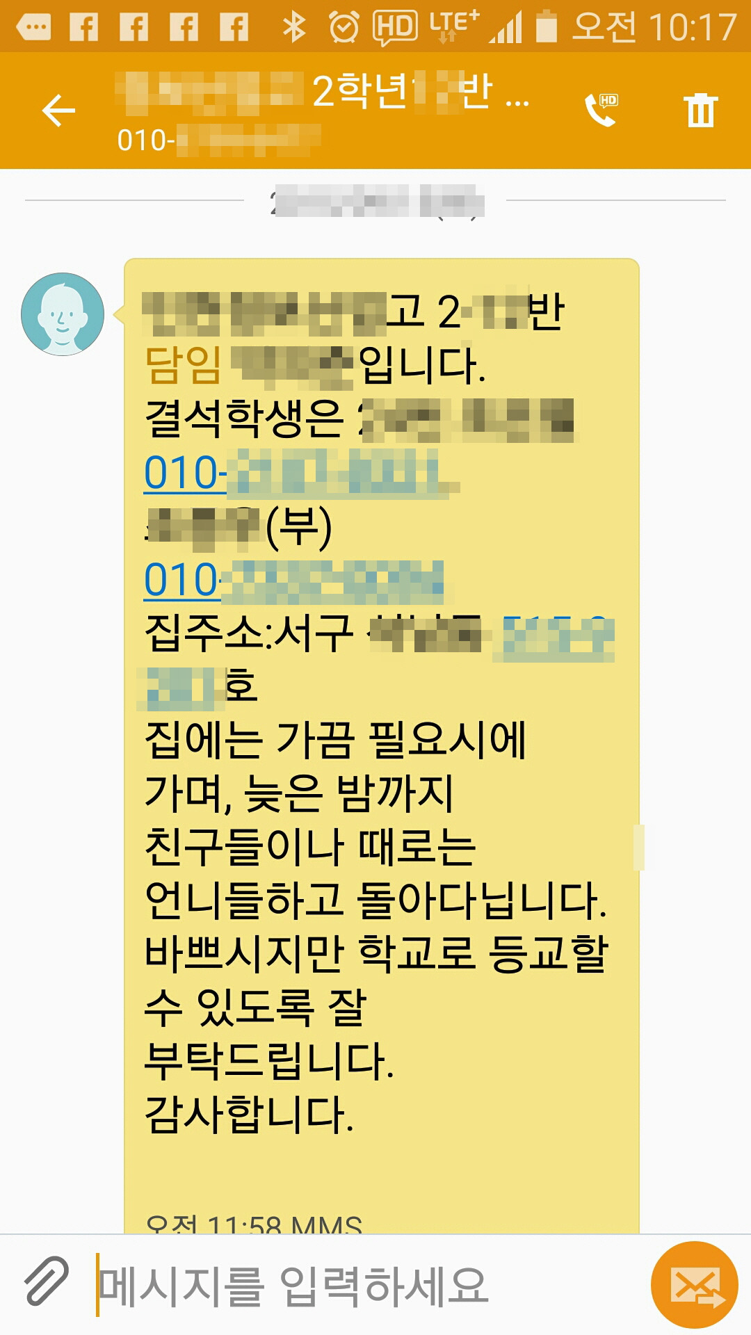 담임선생님께서 이리 연락 주시면 그날 저녁은 가정방문을 하는 날이다. 거리는 상관없다. 그냥 당연하다고 생각하고 가면 힘들다는 생각은 들지 않는다. 물론 학생에게 먼저를 전화를 하지만 대부분이 전화를 받지 않는다. 그럼 저녁에 페**북과 카**톡으로 2차 접선을 시도한다. 그래도 안되면 이 친구와 서로 아는 친구로 되어 있는 친구를 수배해서 다시 부탁한다. 이게 마지막 3차 시도다. 그리고 부모님께도 연락을 한다. 반반인 것 같다. 결손가정이거나 조. 부모 가정이거나. 물론 평범한 가정도 있지만 사실 극히 드물다. 이것을 보면 학생의 학업 관심이 있고 없고는 가정환경이 지배적이라는 것을 알 수 있고 나 또한 이렇게 배웠다. 솔직히 많이 안타깝다.