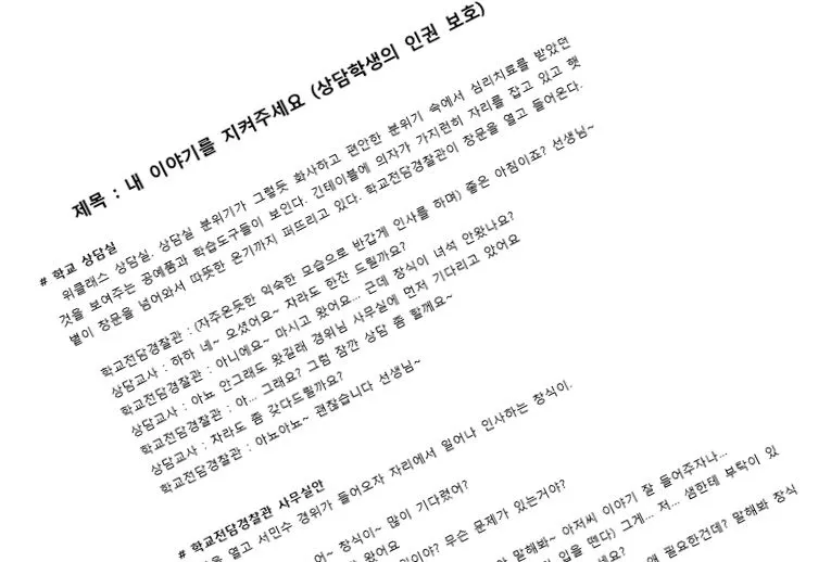 줄거리가 면 뽑기에서 국수면이 나오듯 술술 뽑아져 나왔다. 몸캠을 당한 학생이 학교전담경찰관에게 이를 상담하고, 학교전담경찰관은 이 사실을 태연하게 다른 사람들에게 누설함으로써 상담학생의 사생활과 치부가 노출되는 인권침해. 길고 스토리가 짧은 것이 흠이지만 학생들과 같이 영화를 찍기에는 소재와 대사의 무게감이 가벼워 괜찮을 것 같았다.