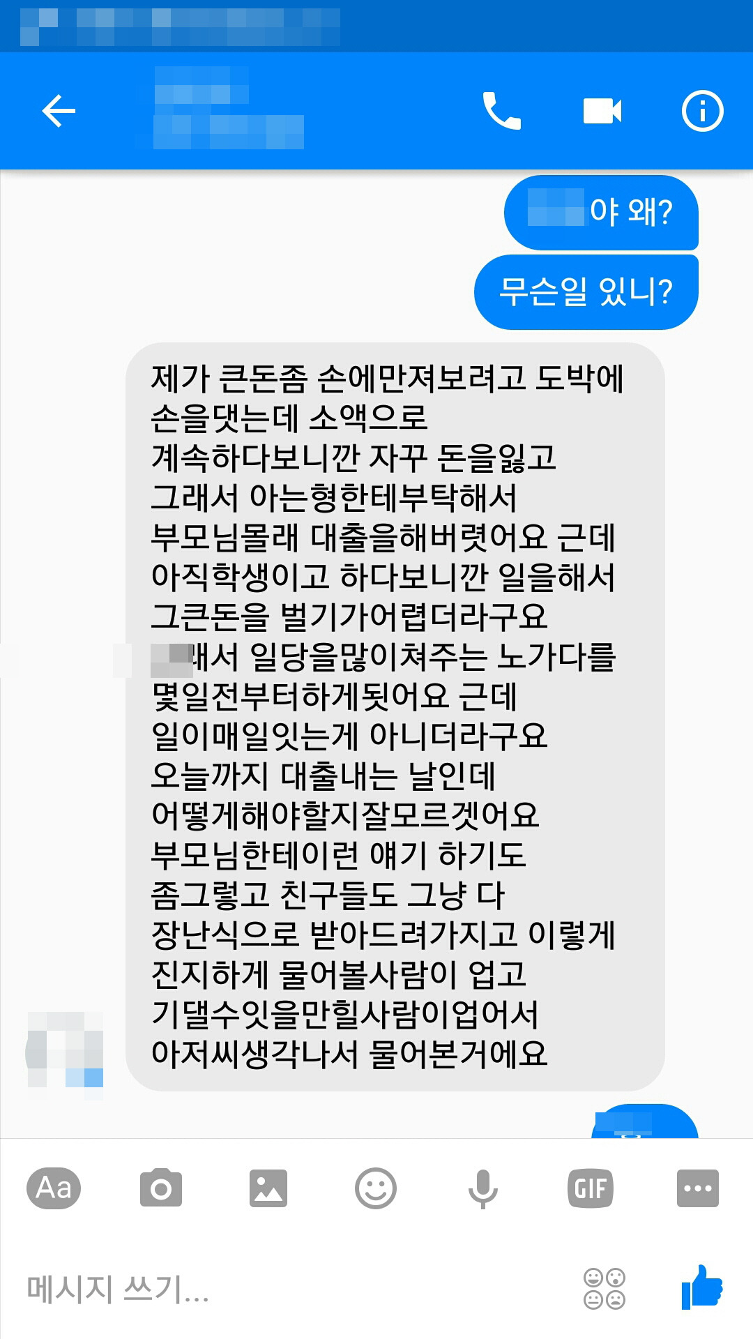 학생이 페**북 메신저로 도움을 요청했다. 늘 불안한 모습들을 보여주었지만 그렇다고 사고를 치거나 다짜고짜 도와달라는 말을 해본 적은 없다. 그런데 장문의 메시지를 보냈다. 메시지의 요지는 '대출'이었다. 도박사이트에 손을 댔고, 돈이 없어 아는 형 이름으로 대출을 받아 매월 20여만 원씩 갚아 나갔는 데 오늘 이자를 내지 못해 어떻게 해야 할지 모르겠다고 한다. 오늘 이자를 내지 못하면 하루마다 대출금의 20% 가까이 연체료를 내야 한단다.