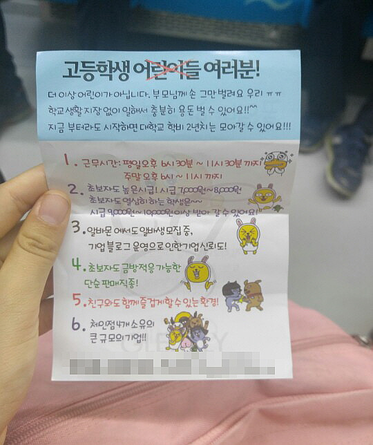 여고 중에서도 인문고보다는 특성화고 앞이 더 많고. 아르바이트 인력이 필요한 업체는 다른 어떤 곳 보다 특성화고 학생들을 선호한다. 어리지, 말 잘 듣지, 급여에 약하지... 등등. 참 좋은 조건들을 가지고 있는 것이 바로 고등학생 아르바이트다. 게다가 홍보 문구 또한 그들과 친화적이다. 여학생들이 선호하는 귀엽고 친근감 있는 문구로 학생들의 인성을 자극하며 스스로 열심히만 하면 돈은 더 많이 벌 수 있다고 홍보하고 있다. 누구나가 현혹될 수 있는 그런 문구다. 사실도 그랬으면 좋겠지만.