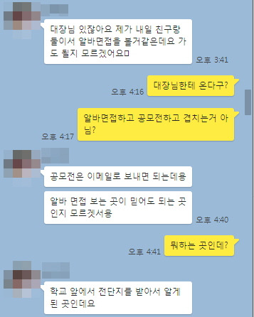 주말 시간을 이용해 아르바이트를 하고 싶은 데 마땅한 게 없었다. 그러다 우연히 하굣길에 나눠주는 아르바이트 구인 광고지를 보고 마음이 현혹됐다. 그리고 내게 메신저를 보냈다.