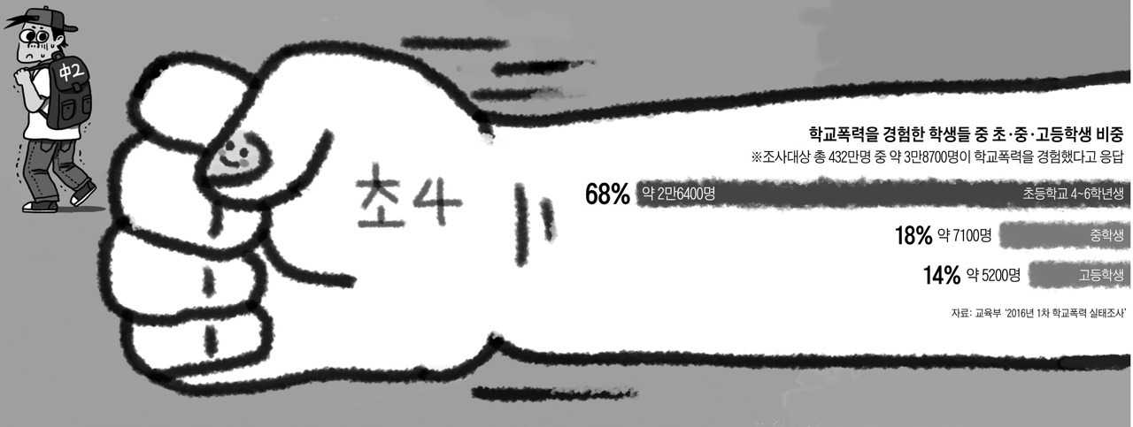 '중2병'을 몰아내고 '초4병'이라는 신조어가 나올 정도로 학교폭력의 연령 또한 현저하게 낮아진 상태다. 이제는 북한의 김정은이 무서워해야 할 대상은 중학생 2학년이 아닌 초등학생 4학년이라는 것을 알아야 할 것이다. 더구나 피해학생의 기준에서 보자면 중. 고등학생들은 사이버폭력을 당하더라도 버틸 수 있는 저항력이 초등학생보다는 훨씬 높다. 하지만 초등학생의 경우에는 사이버 폭력을 당했을 때 저항하거나 이겨 낼 수 있는 '버팀력'이 매우 부족하다. 다시 말해, 고등학생이 아프다면 초등학생은 죽고 싶을 만큼 아프다는 뜻이다.