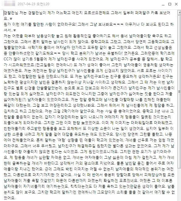 고민을 보내온 여학생은 시작부터 양해를 구했다. 글을 쓴 자기가 누구인지 어느 학교에 다니는지 제발 경찰관님이 궁금해하지 말아주세요 라는 거다. 그럼 당연히 궁금해하지 말아야지. 대장님이라고 불렀다면 조금은 더 오픈해서 이야기했을 수도 있다. 하지만 메시지에서도 보았지만 '경찰관'이라는 용어를 썼다면 내가 알 수 있는 학생은 아니었다.