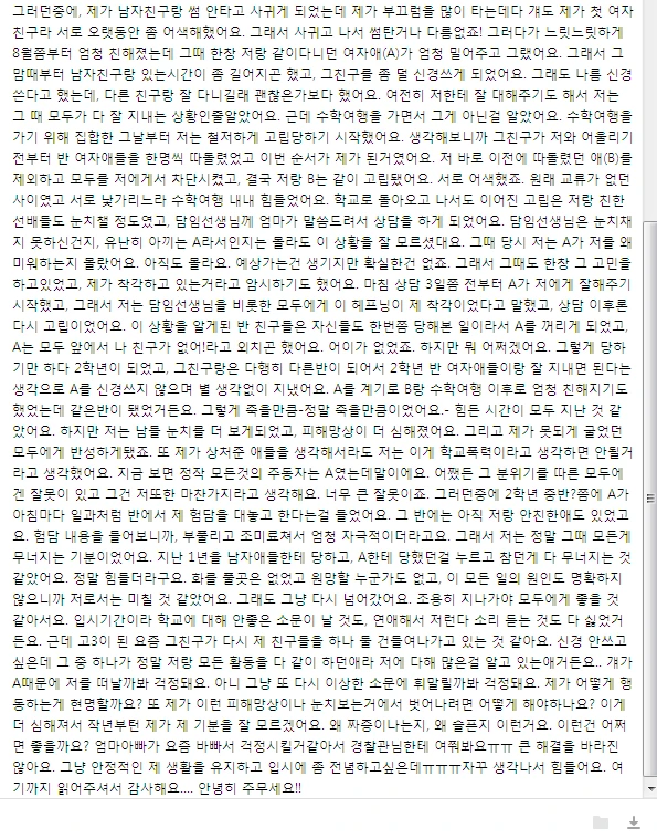 여학생이 보내온 긴 장문의 메시지를 읽으시고 이 여학생을 위해 여러분께서 직접 조언을 해주시는 건 어떨까요? 아니 이 여학생이 만일 여러분의 자녀와 친척 조카라면 여러분은 과연 어떤 조언을 해주실 건가요?