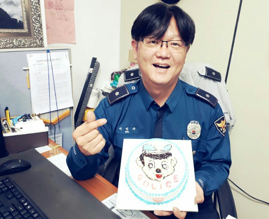 학생의 수줍고 서투른 손때가 묻어 있는 수제 케이크였다. 그것도 경찰의 날이라고 '포돌이' 그림을 생크림으로 직접 그려서 만든 케이크. 세상에서 단 하나밖에 없는 수제 케이크. 와우... 와우...