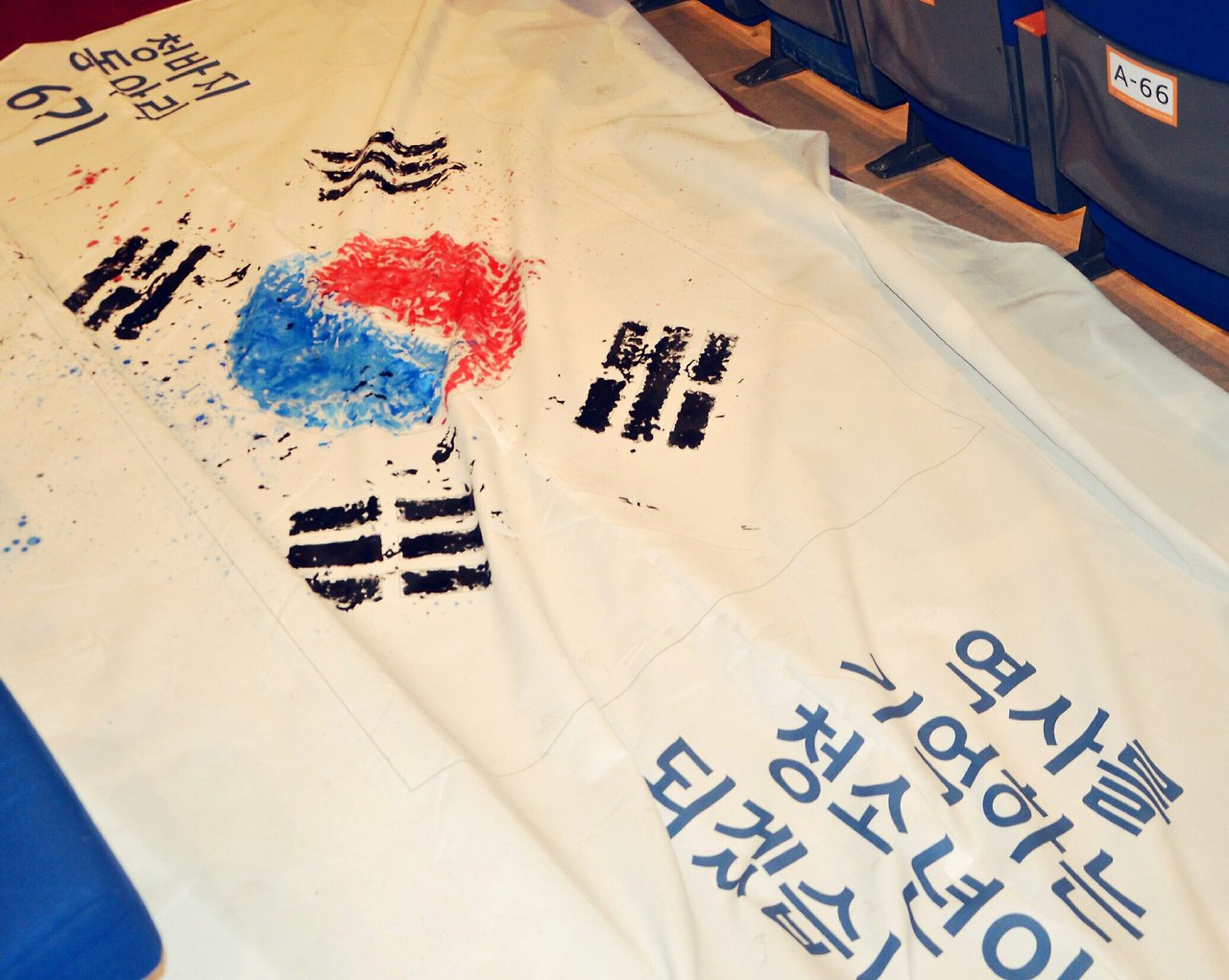 오늘 나는 그들이 만든 태극기를 교수실로 가져왔다. 공간이 좁아 이 대형태극기를 어찌 전시할 지 앞으로가 고민이다.