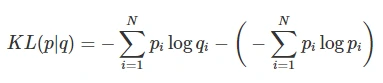 위 식의 두 번째 항은 q와 관련된 정보가 없습니다. 예측 결과를 확인하고 분포 차이를 확인하는 데에 쓸모가 없는 상수가 됩니다. 따라서 두 번째 항을 제외하고서 식을 줄여보면 아래와 같습니다.