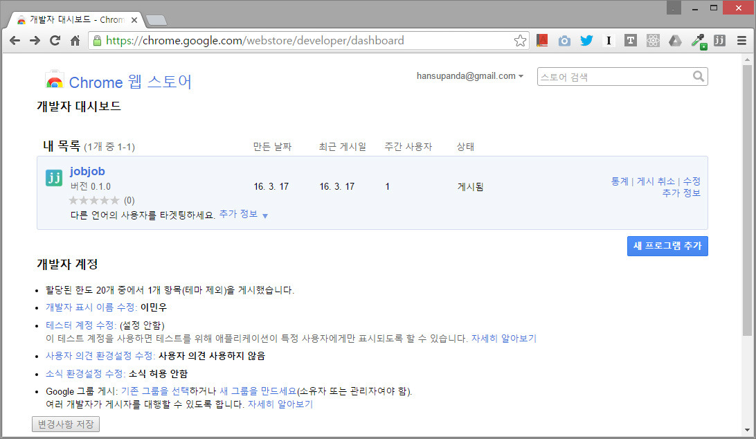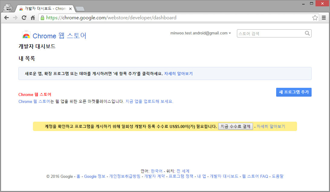 놀랍게도 크롬 앱스토어에 익스텐션 하나 올리려면 개발자 등록과 함께 수수료를 지불해야 한다. 세상에..