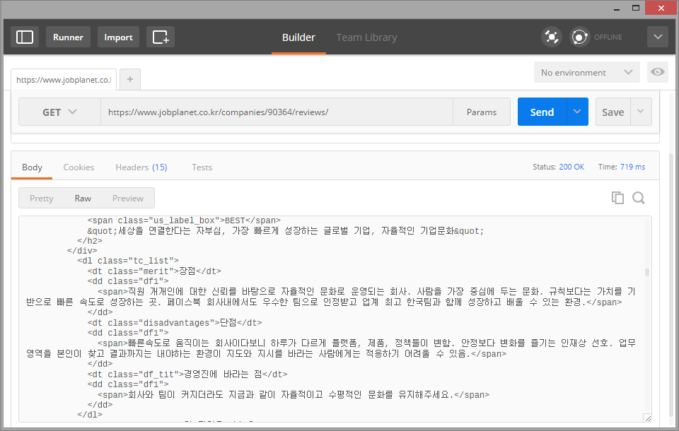 안타까운 것은 잡플래닛이 리뷰 정보를 열람을 위한 API를 제공하고 있지 않다는 점이다.