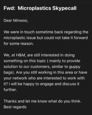 가능성을 확인하고 수집한 마이크로 플라스틱을 쓰레기로 처리하기보다 이를 활용할 수 있다면 새로운 시스템을 만들 수 있을 것이라는 가설을 만들고 리서치를 하였고 그 당시 H&M에서 관련 연구를 진행하고 있는 것을 확인하여 그 당시 담당자가 H님이였습니다.