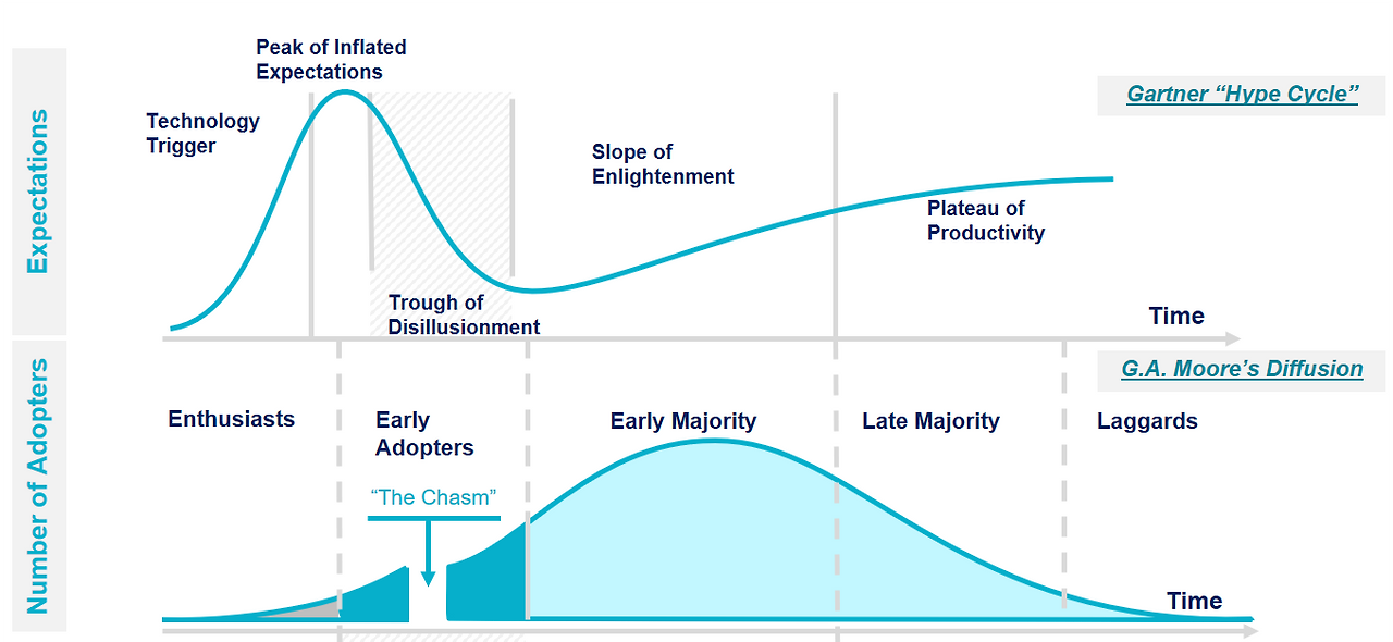그림 1 : https://blog.octo.com/en/accelerate-innovations-by-blending-the-best-practices-of-three-models-of-innovation-diffusion-gartner-g-a-moore-c-christensen/