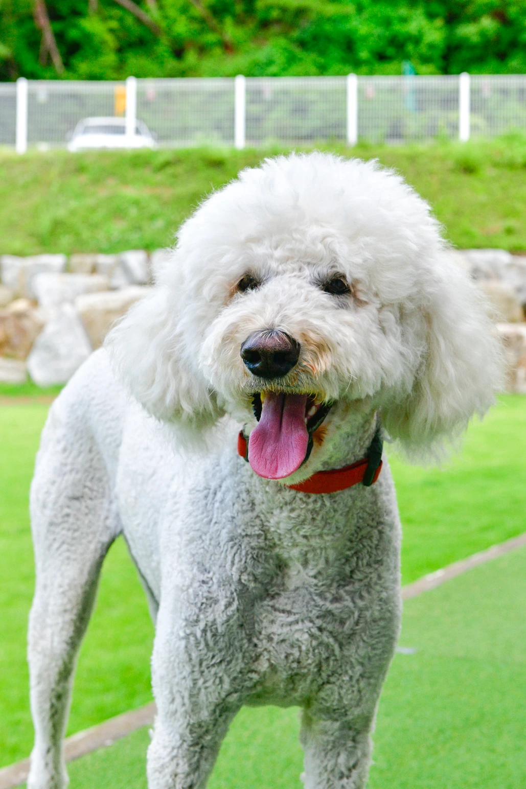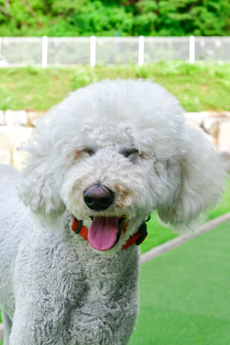 꼬리를 살랑거리면서 조심스레 기쁨이에게 온 이 상주견은 오래간만에 찾아온 새 친구가 마음에 쏙 들었는지 우리 뒤를 졸졸 쫓아왔다. 전 날 내내 심통이었던 기쁨이도 그제야 활짝 웃는 얼굴이다. 둘은 잔디밭을 내달리고 내달렸고 서로 마주 보고 냄새도 맡다가 또다시 내달렸다. 커다란 키의 스탠더드 푸들을 따라잡겠다고 우리 기쁨이는 정말이지 치타처럼 네 다리를 앞 뒤로 180도 이상 쫙쫙 뻗어가며 죽어라 달렸다. 동네에서 그래도 꽤나 알아주는 달리기 견인 기쁨이는 처음으로 자신이 이길 수 없는 존재가 있음에 몹시 놀란 눈치다. 계단을 한 번에 5칸은 뛰어내리는 친구를 보고 기쁨이는 간도 크게 자기도 5칸에서 점프를 하면서 뛰어내렸다. 기쁨이의 그 공중 체공 모습을 본 우리 부부는 순간 아니야!!!! 했고 동시에 기쁨이는 멋진 착지를 하려다 턱를 바닥에 제대로 드리 받았다. 아픈지 모르는 건지 그저 좋아서 한참을 놀던 둘. 큰 친구는 기쁨이를 수풀이 있는 곳으로 안내를 했는데 갑자기 시야에서 사라진 두 아이가 걱정돼서 달려가보니 이 친구 산에서 흘러 내려오는 계곡물을 기쁨이에게 안내를 해주고 있었다.
