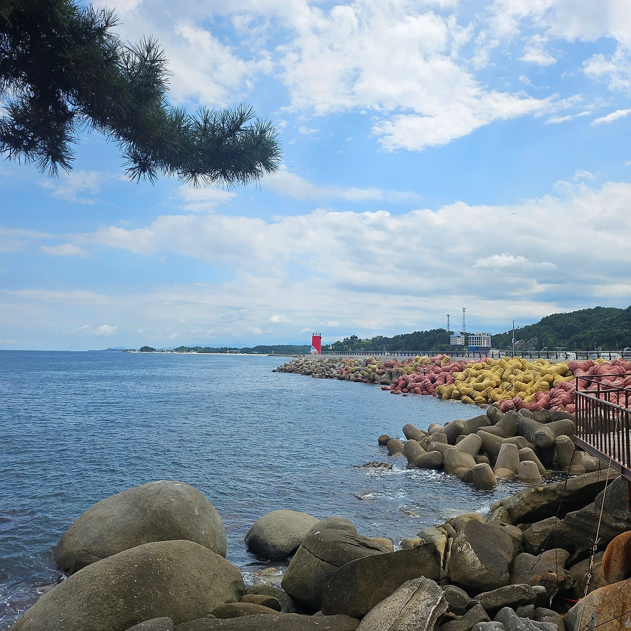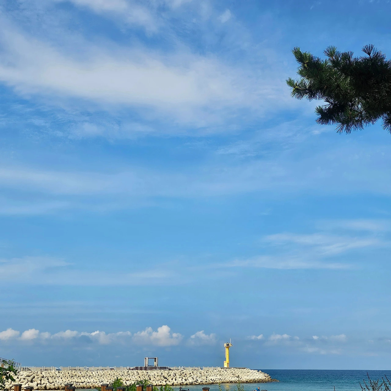 날씨가 정말 끝내주게 맑다. 뙤약볕이기는 하나 확실히 바닷가여서인지 그늘에 있으면 그래도 시원하다. 기쁨이는 바다보다도 연신 상의탈의를 하고 몸에 멋진 그림을 선보인 채 다니는 서퍼들이 신경 쓰이는지 눈이 빙글빙글 돈다. 쿵쿵 울리는 노래도 그렇고, 주변에 세상 개성 넘치시는 분들도 그렇고, 왜 친구들이 '양양'이 우리랑 어울리지 않다고 했는지 이해가 갔다. (팔에 스티커라도 붙여야 하지 않나.. 싶을 만큼 우리만 너무 단색 도화지 같다.) 세상 보수적인 우리는 사람들을 피해 최대한 조용한 산책로만 골라 다녔다. 푸르른 바다와 하늘을 바라보며 더위 때문에 헥헥 거리는 기쁨이라서 사진을 많이 담지는 못 했다. 정말이지 여름은 강아지와 여행을 하기에 가장 최악의 계절이긴 하다. 털 옷으로 둘러싸여 있는 데다가 땀샘도 발바닥 밖에 없는 강아지들은 그야말로 조그만 밖에 다니면 숨이 넘어갈 지경으로 숨을 쉰다. 기쁨이의 혀도 한껏 밖으로 삐져나왔다.