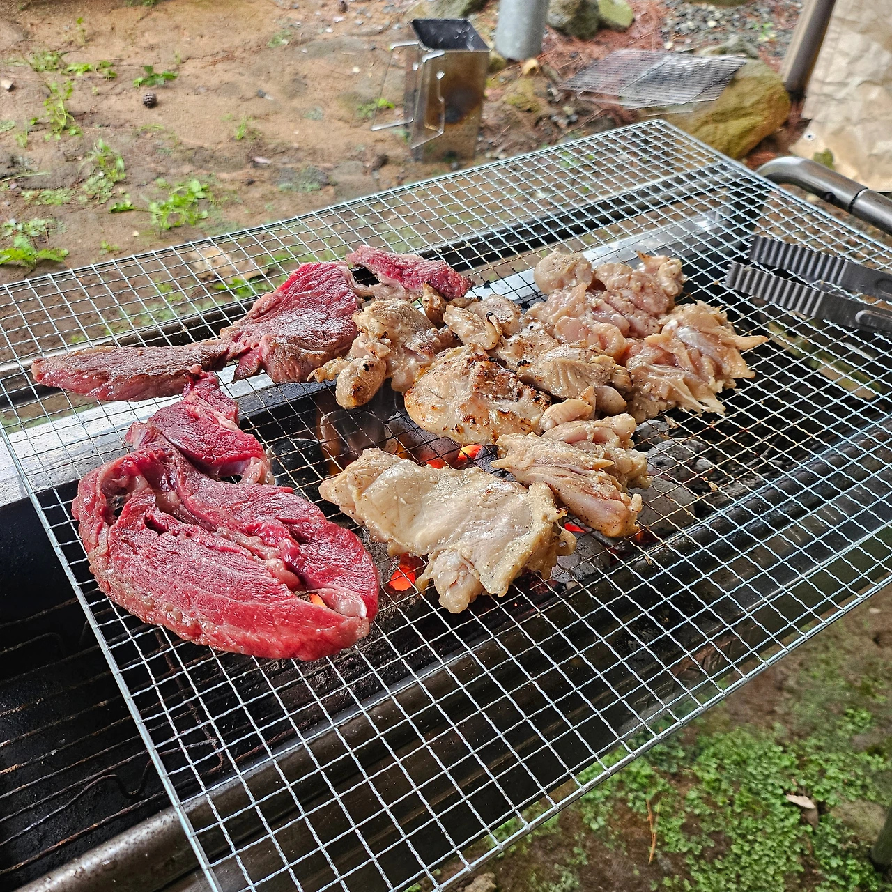 기쁨이는 이유도 모른 채, 아마도 가까운 산책길을 나서는 줄 알고 신나게 차에 올랐을 것이다. 그런데 차가 점점 달리고 내릴 기미가 보이질 않자 이 녀석 가는 내내 한숨을 있는 대로 쉬어댔다. 창 밖을 보다가 한숨, 내 얼굴을 마주하다가 한숨, 운전하는 남편 팔을 붙잡고 또 한숨, 그러다 마침내 포기한 듯 깊은 잠에 빠졌다. 비가 주룩 내리고 첫 행선지인 원주에서 우리는 이른 시각부터 바비큐를 즐겼다. 우리 기쁨이는 차에서 자다가 내 품에 안겨 나와 고기 먹는 우리를 애처롭게 바라보며 눈으로 화살을 쏴댔다. '엄마 아빠는 계획 하에 왔지만 나는 내 의지가 아니란 말이다!!! 고기라도 줘라!!!!!!!' 기쁨이는 우리가 나눠준 고기+사료를 정신없이 먹고서 또다시 깊은 잠에 빠진다. 차로 장거리를 이동하는 것이 강아지에겐 여간 힘든 일이 아닐 터라 여행지에 온 첫날이면 거의 기쁨이는 초저녁부터 기절모드다. 그래도 멀미를 크게 하지 않으니 그게 어디인가.