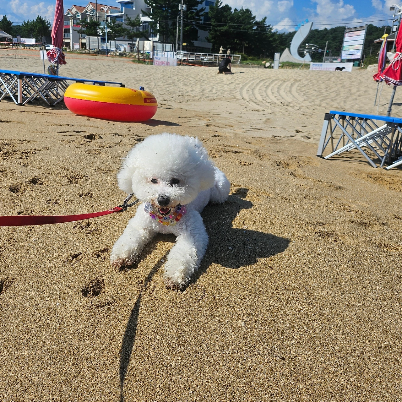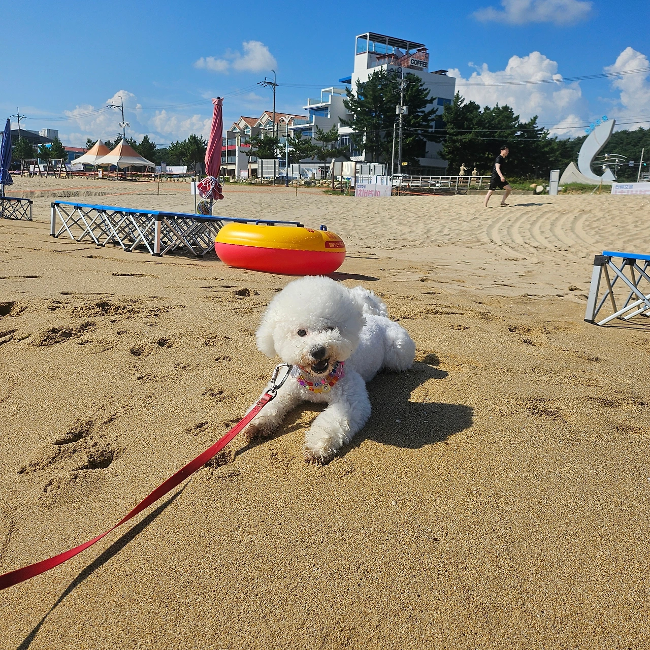 올해는 생각보다 수온이 낮아서 완전하 들어가지는 않고 발만 담그다가 나왔다. 다가오다가 사라지는 물을 열심히 쫓아 뛰던 기쁨이는 순간 도망칠 타이밍을 놓쳐서 네 다리가 흠뻑 젖었다. 그래도 시원한 본인 발이 마음에 들었는지 연신 헤헤 웃으면서 모래사장 엎드려 해맑게 웃었다.