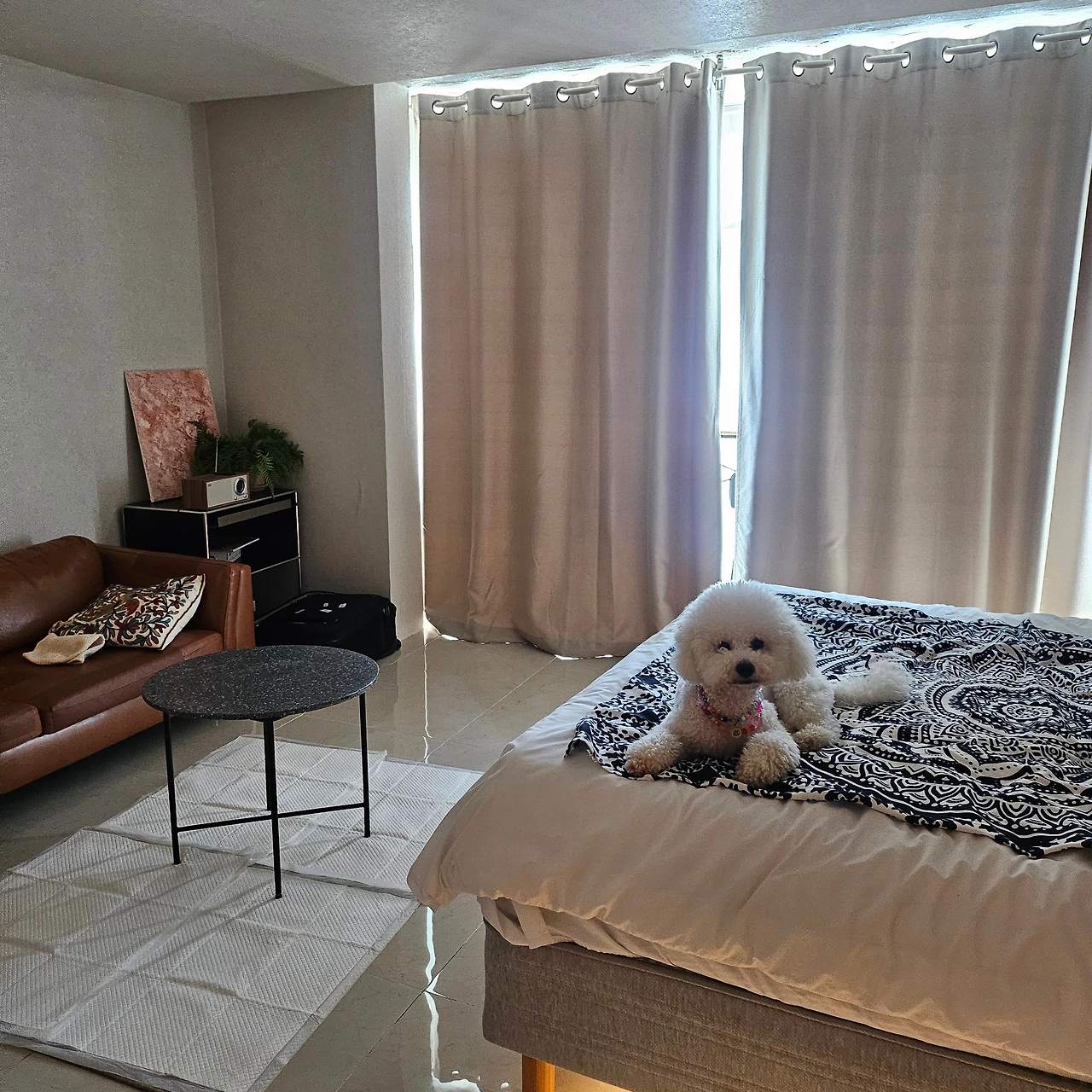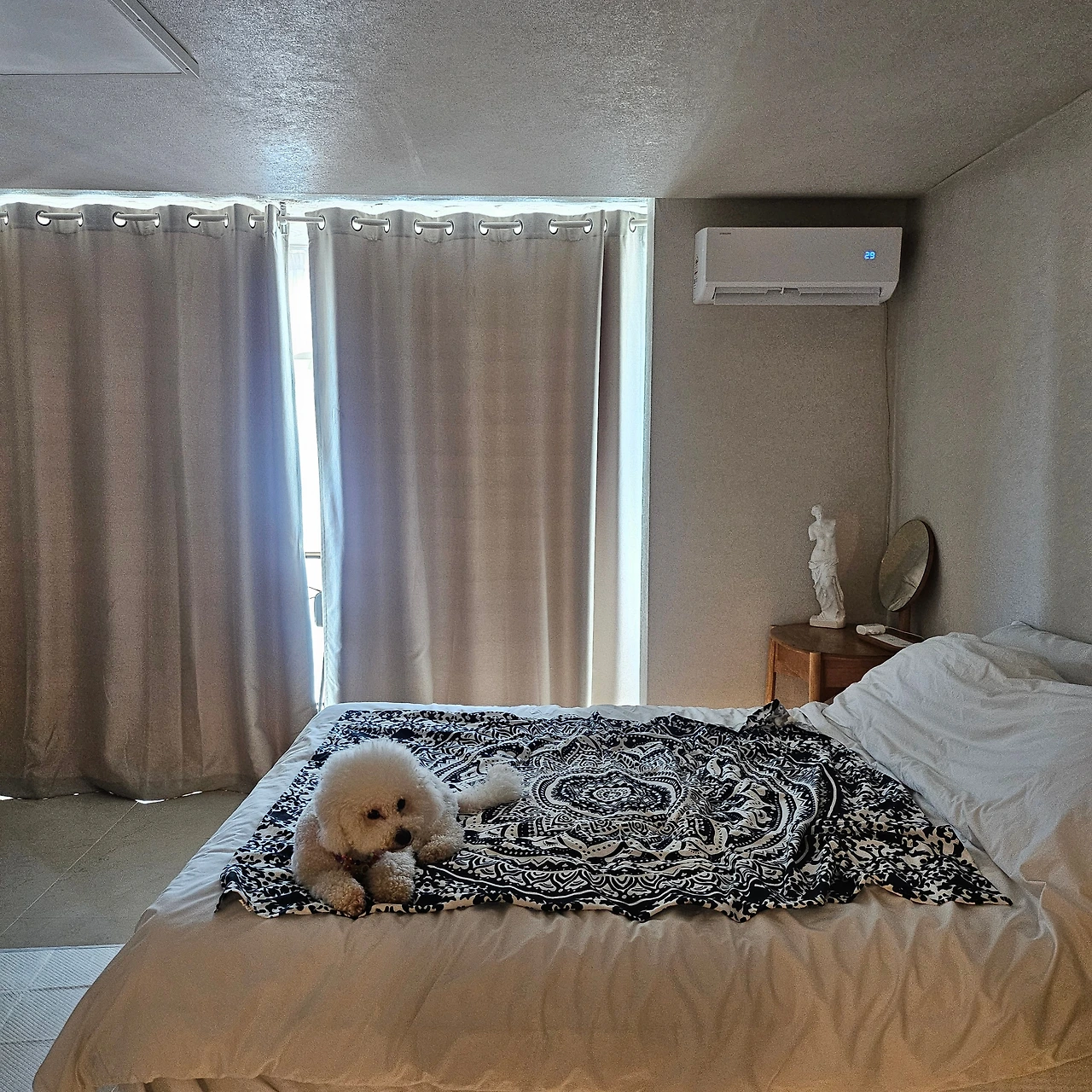 숙소에 오자마자 침대부터 차지하는 기쁨이. 아침에 친구강아지와 달렸던 것이 컸는지, 아니면 집이 그리워서 마음이 허했는지 평소에는 잘 먹지도 않던 사료를 이 날은 두 번이나 맛있게 먹었다. 친구에게 기쁨이가 밥을 두 번이나 먹는다고 했더니, [사람인 나도 너랑 하루를 다니면 나중에 피곤해서 뻗는데 기쁨이는 오죽하겠어!]라는 메시지가 날아왔다. 미안하다. 돌아다니기 좋아하는 엄마라서. 이 날도 기쁨이는 초저녁부터 잠을 청했다. 참고로 우리 기쁨이.. 집에서는 저녁 8시부터 호랑이 기운이 솟아나고 밤 12시까지 공 던져달라고 날아다니는 강아지인데 여기와 서는 새나라의 강아지가 다 됐다. 머리만 바닥에 닿으면 코를 댕댕 골며 자는 우리 강아지.