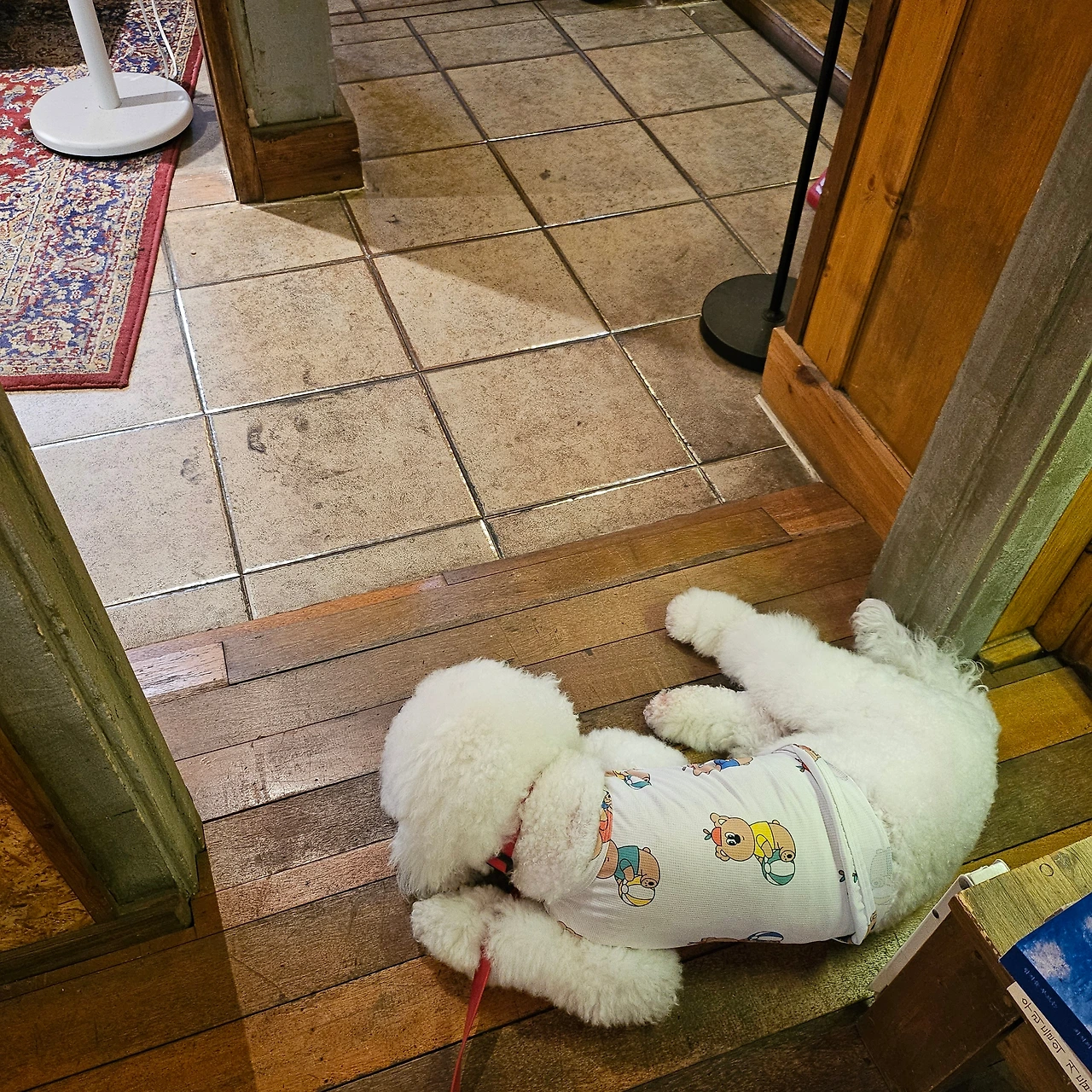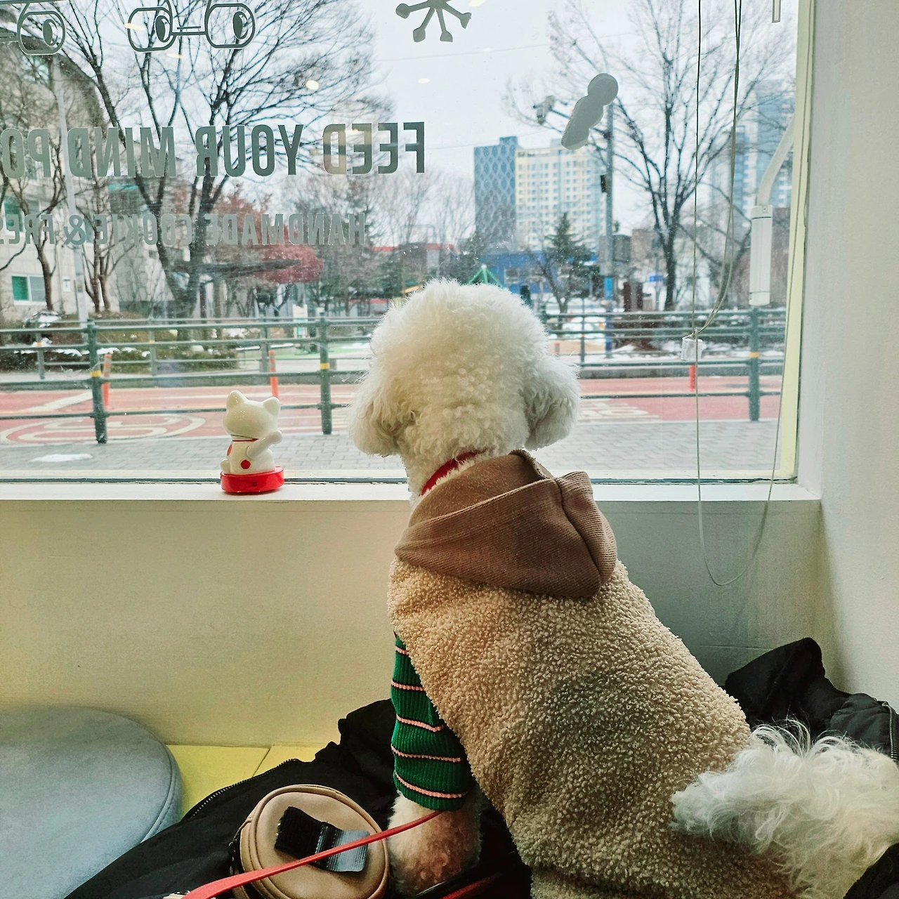 기쁨이를 너무나도 사랑하는 주변의 기쁨존 여자 사장님 누나들을 지켜내겠다는 마음인 건지, 기쁨이는 가게에 가면 바로 문가에 자리를 잡고 창 밖을 주시한다. [기쁨아, 우리 약하지 않아, 안 지켜줘도 돼]라고 누나들이 아무리 말을 하고 달래도 기쁨이의 지정석은 늘 문 앞이다. 그래서 나는 커피를 마실 때에도, 사장님들과 이야기를 나눌 때에도 항상 밖을 주시하면서 기쁨이의 목 줄을 꽉 잡는다.