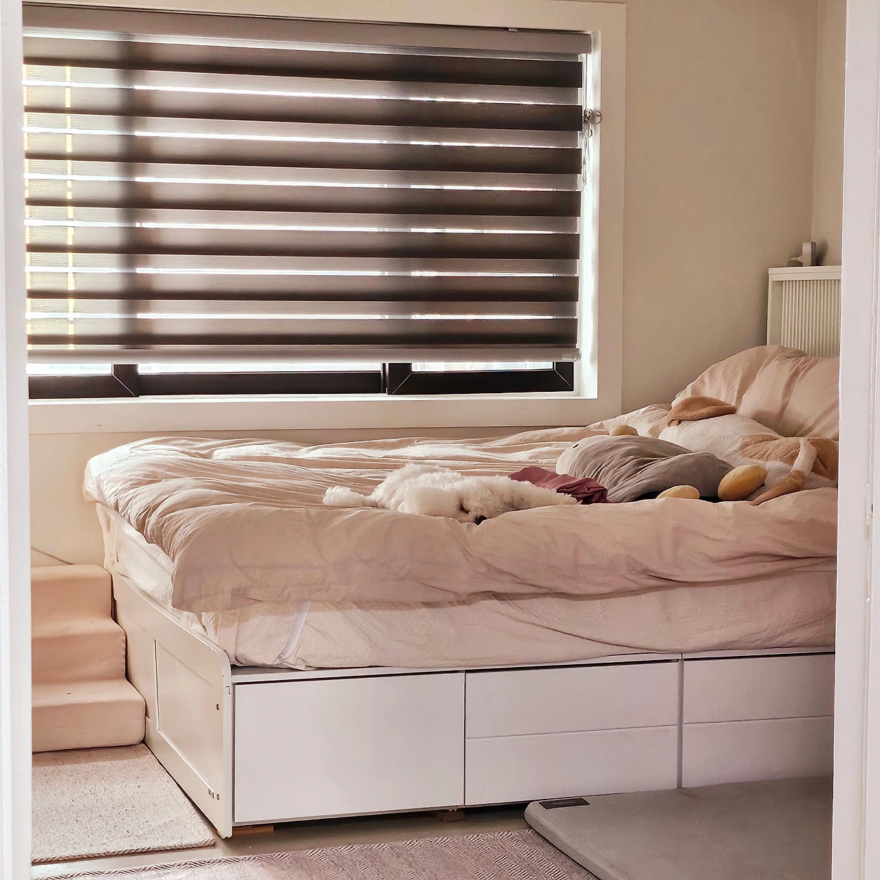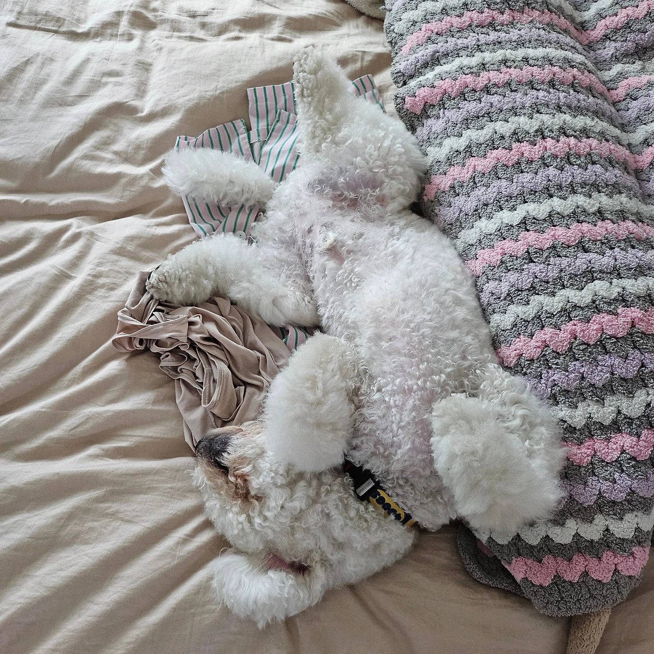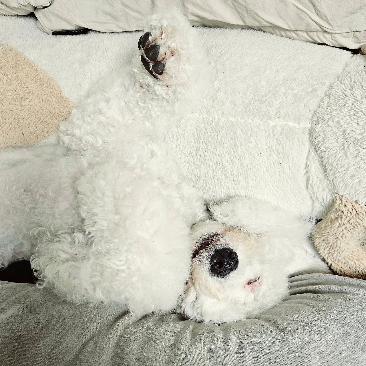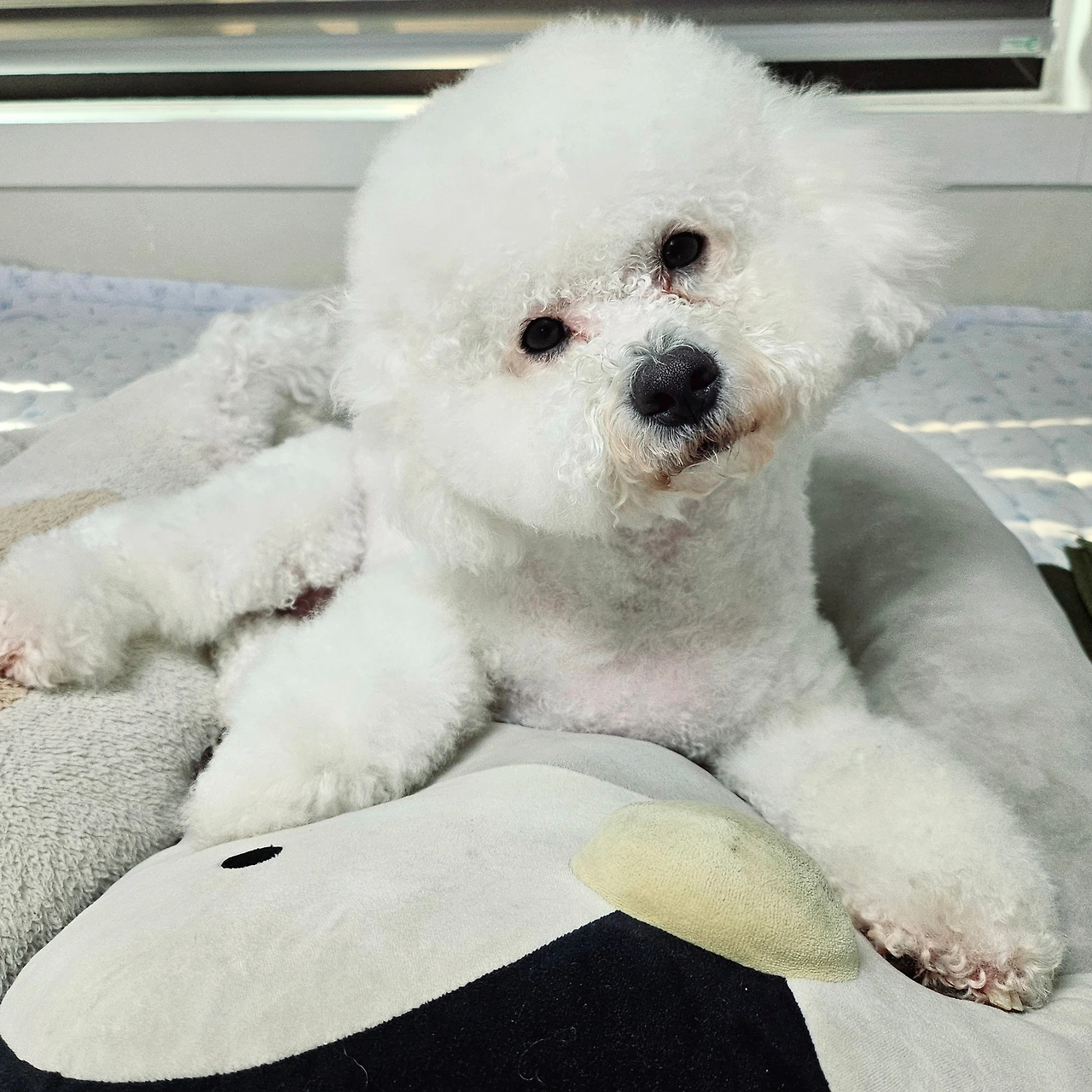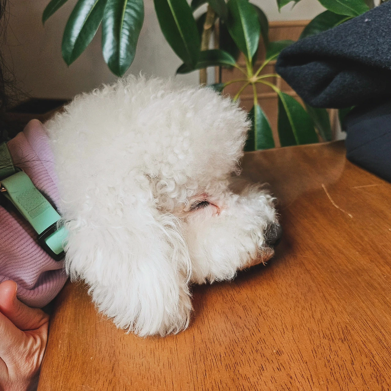 마지막 전쟁은 바로 목욕 후 드라이였다. 와.. 이건 정말 너무 힘들어서 나도 남편도 진을 다 뺐던 기억이 많다. 윙~하는 소리와 함께 흠뻑 젖은 몸을 이끌고 이리저리 뛰어다니면서 어떻게든 드라이기를 피하겠다는 기쁨이와, 그런 기쁨이를 잡으러 같이 뛰어다니는 우리. 겨우 잡아서 말리기 시작할 때면, 기쁨이는 발톱을 잔뜩 밖으로 꺼내 내 등이며 목이며 머리 꼭대기까지 고양이 수준으로 타고 올라갔다. 도망가고 붙잡고 긁히고의 대행진. 가뜩이나 곱슬 털이라 속까지 말리는데 적어도 40분이 소요되는 것을 이 난리를 치니 1시간이 훌쩍 넘어갔다. 대망의 드라이가 끝나면 남편의 온몸은 기쁨이가 할퀸 영광의 상처가 가득했다. 한 번은 드라이가 힘들어서 목욕까지 전문가에게 맡긴 적이 있었는데, 1시간 뒤에 찾아간 곳은 온통 바닥이 물천지였다. 기쁨이가 목욕 때도 반항을 하고 난리를 쳤다는데 우리 부부는 갸우뚱했다. 드라이기를 거부하기는 했지만 목욕을 거부한 적은 한 번도 없었고, 미용을 받을 때도 [참 착해서 목욕도 미용도 잘한다.]는 얘기만 들어왔던 터였다. 처음 간 곳이라 그런 건지, 미용사분의 손길이 기쁨이에겐 불편했던 것인지, 집에 오자마자 스트레스 때문에 몇 시간이고 자는 모습을 보니 더더욱 드라이 때문에 업체에 의지해서는 안 될 것만 같았다. [그래.. 차라리 반항해서 혼나더라도 남이 아니라 엄마아빠한테 혼나는 게 낫지..] 주변 견주들이 우리에게 주신 팁은 간식, 그리고 중간중간 휴식해 가며 말리기였다. 말이 쉽지.. 한 사람은 간식을 들고 강아지의 관심을 끈 채 폭풍 빗질을 하고 나머지 한 사람은 드라이기를 열심히 들고 있어야 한다. 팔이 떨어져 나갈 것만 같고 몹시 피곤하지만, 아마 반년간은 꾸준히 2주마다 그랬던 것 같다. 지금처럼 얌전히 엎드려서 꾸벅꾸벅 졸면서 털을 말린 지는 얼마 되지 않았다.