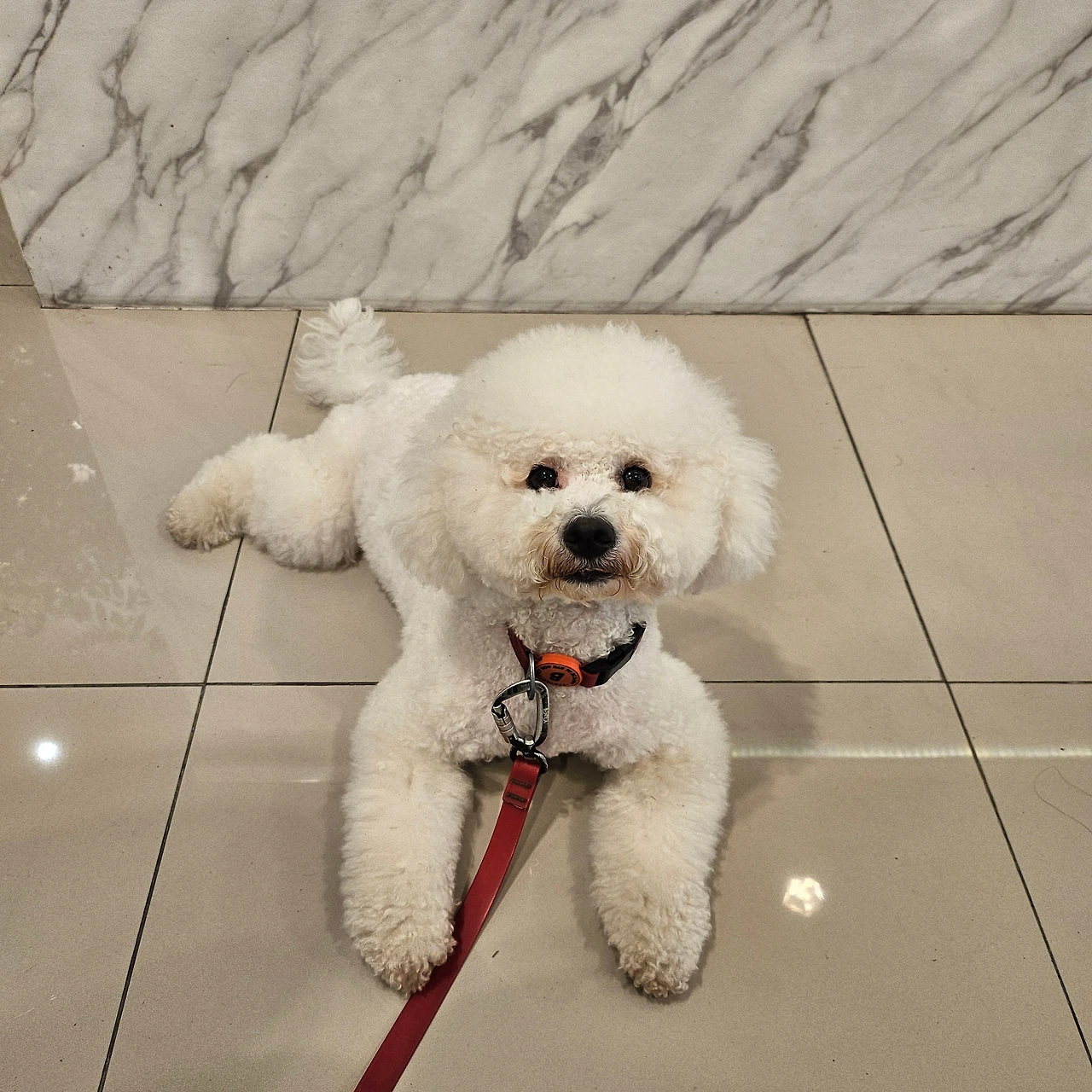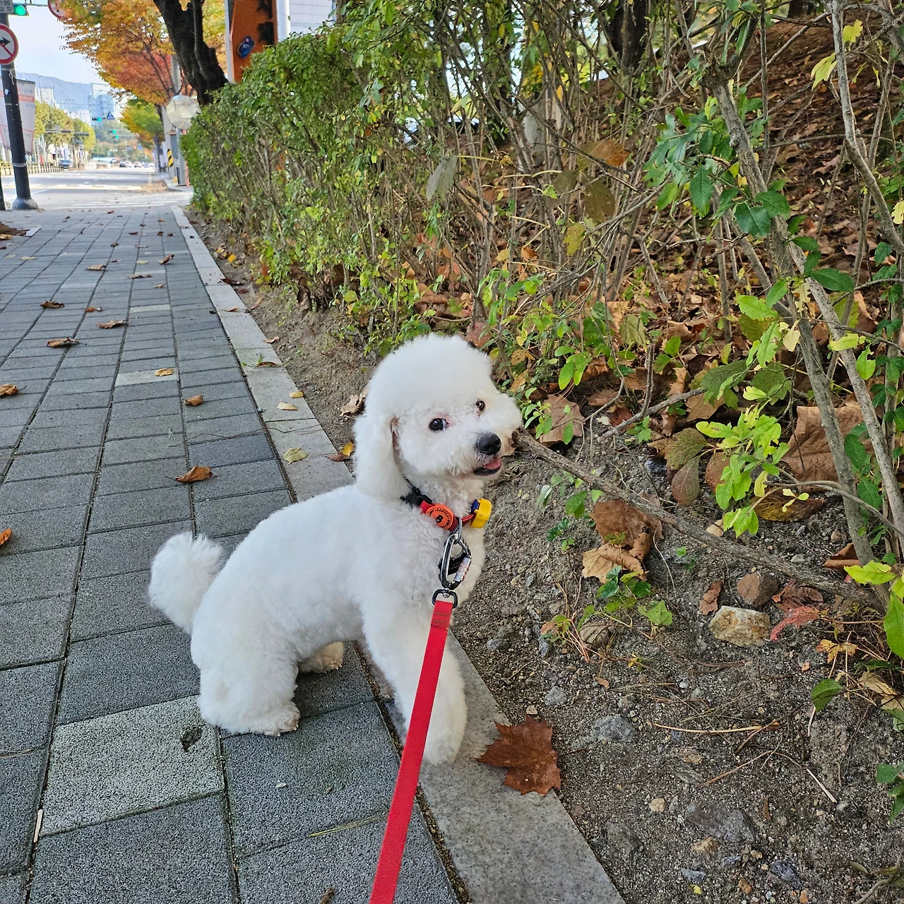 기쁨존 누나 2도 만나 인사도 하고, 공원 할머니들에게도 이쁨을 듬뿍 받고, 비둘기도 쫓아가면서 기쁨이의 흥이 한껏 올라 드디어 살짝 꺾일 무렵에 우리는 어느덧 병원이 위치한 곳의 골목 입구에 진입했다. 골목에 다다르자마자 이 녀석 눈빛이 달라진다. 가뜩이나 동그란 눈이 더 커져서는 나를 바라보면서 은근슬쩍 바닥에 엎드릴 준비를 해본다. 이제 힘이 강한 데다가 엄마가 요즘 허리 때문에 힘을 쓰지 못하는 것을 아는지, 기쁨이는 고집을 부릴 때 최대한 바닥에 납작 엎드리고 [나는 아무것도 모르오] 표정을 짓는다.