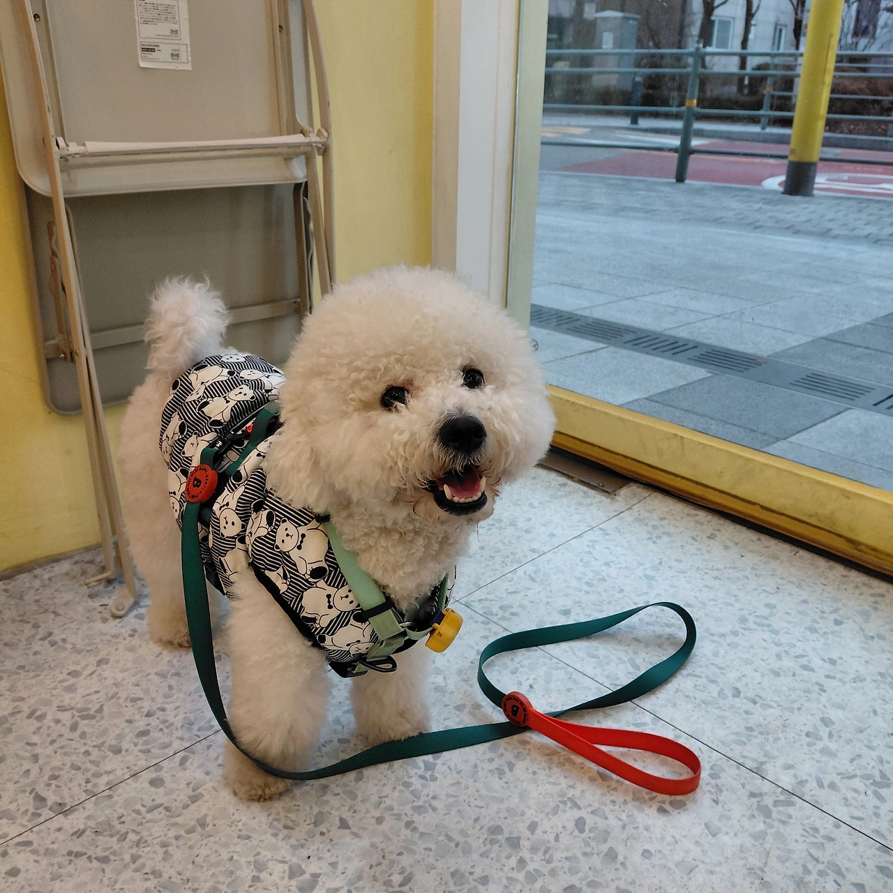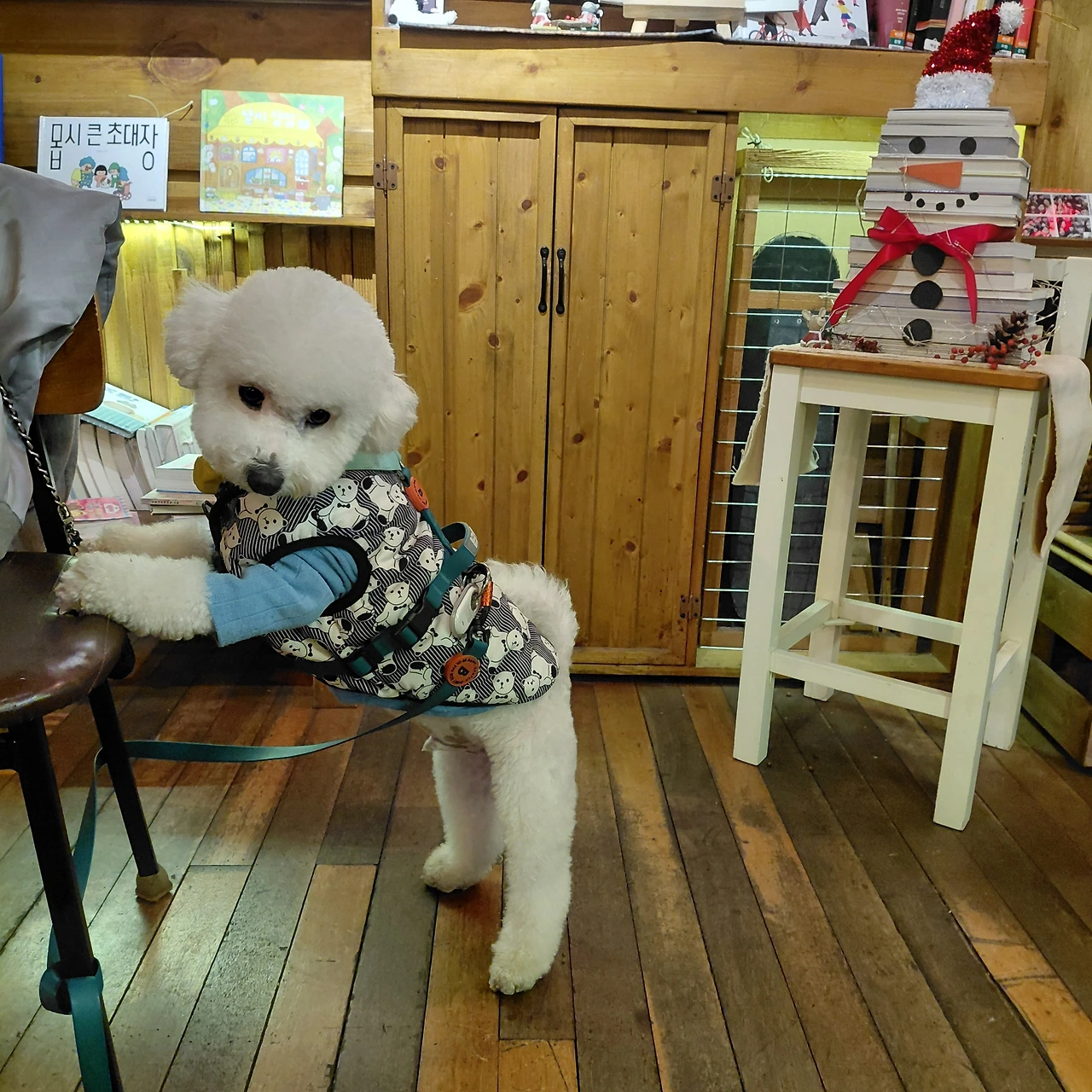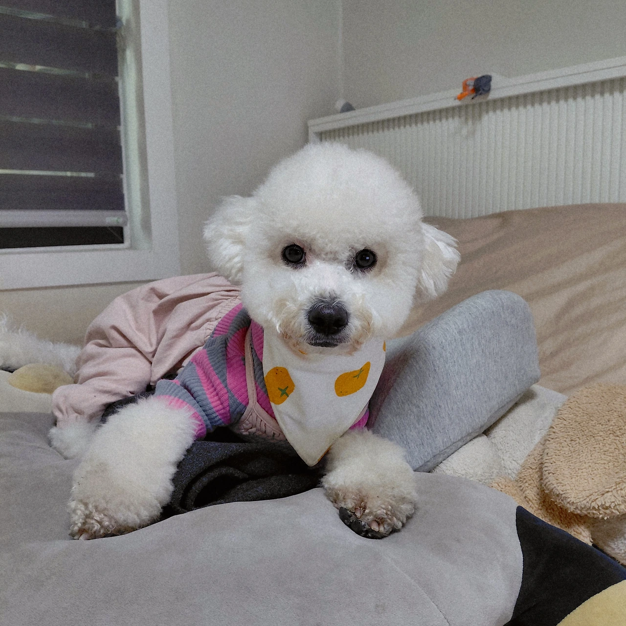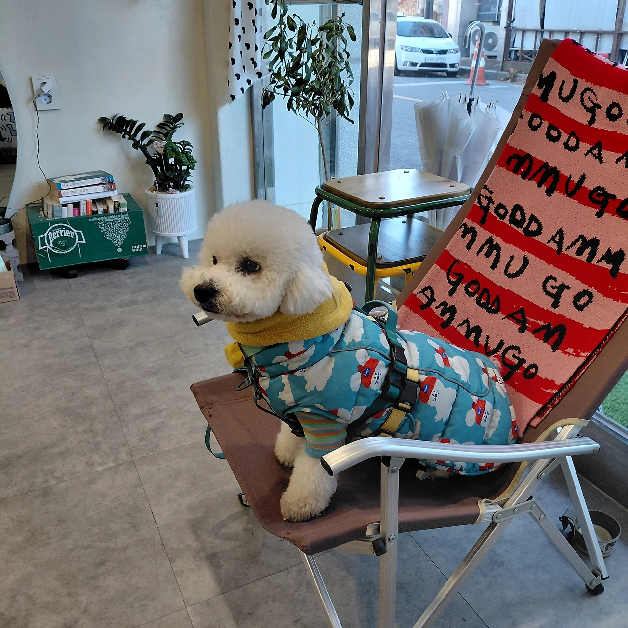 하필이면 털이 가장 짧은 시기에 찾아온 한파라서 기쁨이는 산책을 나갈 때 온통 무장을 한다. 상. 하의와 아우터 그리고 스카프까지. 이렇게 입혀놓고 보면, 옛날 유치원 우리 반 아이들의 패션과 꼭 닮아있다. 너무 답답한가 싶더라도 좀 얇게 입히면 금세 복부가 차가워지니 서로 귀찮고 불편하더라도 꼼꼼히 입혀서 나간다. 낮에는 괜찮은 과정이나, 오늘 새벽같이 소변보고 싶다고 우리를 깨울 때는 비몽사몽으로 하나하나 입혀야 하는 것이 좀 힘들긴 하다.