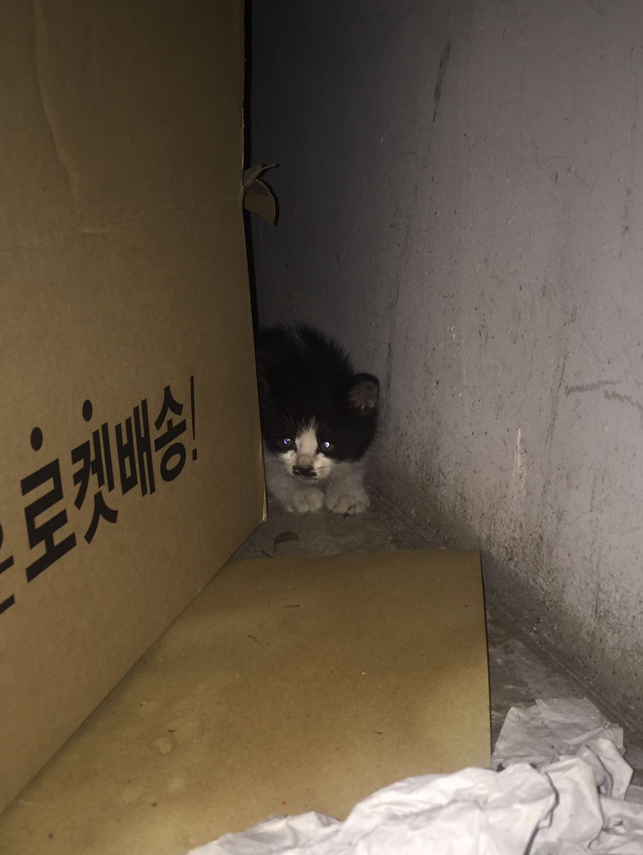 울음소리가 거슬린 건 나뿐만이 아니었나 보다. 같은 건물에 살고 있는 이웃도 내려와 주위를 이리저리 둘러보고 계셨다. 플래시를 켜고 살펴보니 이내, 새끼 고양이 한 마리를 발견할 수 있었다.