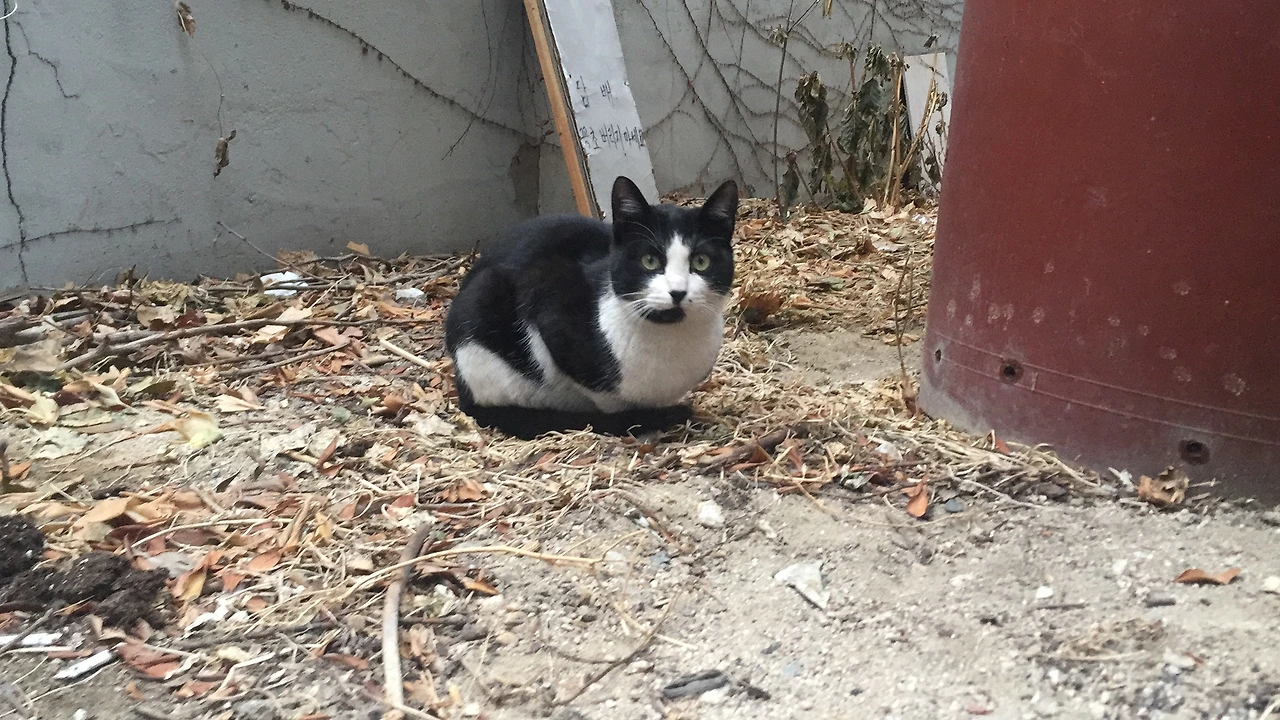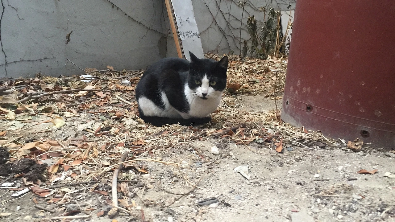 사실 이름을 붙이지 못한 건 이날 처음이자 마지막으로 봤기 때문이다. 찰리와 마리의 형제들 중 한 명인데, 정말 우주 최강 겁쟁이었다. 밥 주려고 밥그릇을 놓아도 움찔, 핸드폰을 꺼낼 때도 움찔. 오만 것에 겁을 내던 슈퍼 겁쟁이는 밥을 먹을 때도 찰리와 마리가 다 먹고 나서야 먹었다. 이 녀석 말고도 다른 고양이가 한 마리 더 있었는데, 그 고양이는 찍지 못했다. 꾸준히 밥 먹으러 와줬으면 좋았겠지만 딱 하루밖에 보지 못해 많이 아쉬운 고양이다.